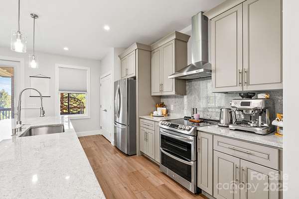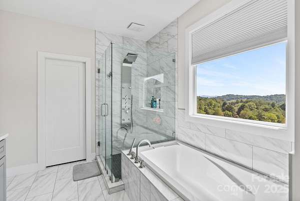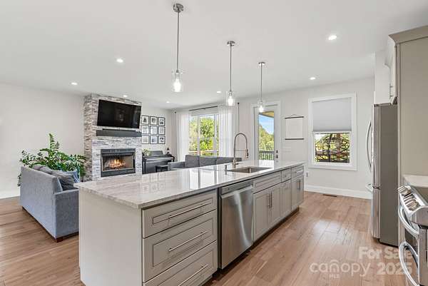 Welcome home to relaxed mountain living just 13 miles from vibrant Asheville. This stylish 3BR/2BA one-level home blends warmth, comfort, and functionality in every detail. From the moment you step inside, you're greeted by an open, airy layout filled with natural light, rich hardwood floors, and the inviting glow of a wood-burning fireplace. The heart of the home is the spacious kitchen-designed for both everyday living and entertaining-featuring a massive island, beautiful granite countertops, abundant cabinetry, and seamless flow into the dining and living areas. Custom built-in closets keep everything organized, while a convenient central vacuum system makes daily upkeep a breeze. Both bathrooms are finished with elegant marble countertops, adding a touch of luxury to your daily routine. Step outside to a large back deck that invites you to unwind and soak in the beautiful mountain views-perfect for morning coffee, weekend barbecues, or peaceful evenings under the stars. Downstairs, the 1,300 sq ft unfinished basement offers endless possibilities. With a slab foundation, plumbing already in place, and partial electrical, it's ready to be transformed into additional living space, a workshop, studio, or anything your lifestyle needs. This home is a rare blend of style, comfort, and untapped potential-all in a serene setting just minutes from the energy of the city. Come experience mountain living at its finest.