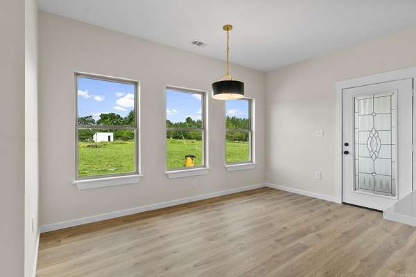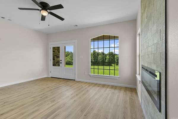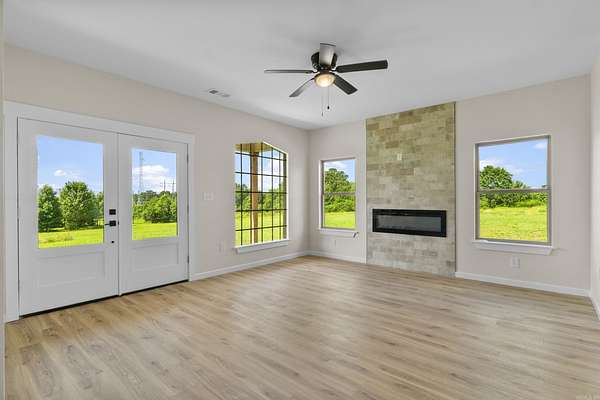 New Construction on Nearly 5 Acres- Tucked outside the city limits, this thoughtfully designed home offers the perfect balance of luxury and rural tranquility on nearly 5 acres. Inside, you'll find 3 generously sized bedrooms and 2 well-appointed bathrooms, designed with both comfort and function in mind. This home features LVP flooring, 2-car garage, and loads of privacy, split floor plan, and more! The expansive kitchen is both functional and inviting, anchored by a center island, offering quartz countertops, ample storage, custom cabinetry, a beautiful backsplash, and outfitted with sleek black appliances. Every finish reflects a commitment to quality, with elevated details and craftsmanship. The living area draws you in with its electric fireplace and hand-picked tile, which adds warmth and charm. The primary suite is an absolute dream and offers unique tiled flooring, a dual vanity, large soaking tub, gorgeous walk-in shower, and a generously sized walk-in closet with shelving. Step outside and take in the peaceful, open views of your own private acreage, complete with a fenced-in area with a small barn ready for your animals! THIS ONE IS A DREAM. Mineral rights do not convey.