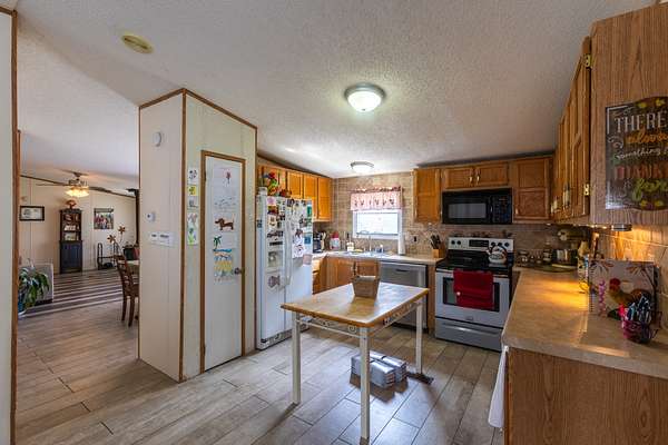 Included is a 24’x30’ garage/shop, built in 2021 on a concrete slab, complete with electricity and a fully functional 6’x8’ walk-in cooler. Additionally, there are multiple small outbuildings and an underground storm shelter. Enjoy the outdoor space with 2 covered porches, including 1 wheelchair-accessible entry, and a gently sloped, spacious yard with creek access and ample space for gardening.