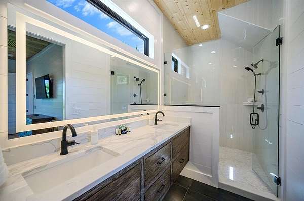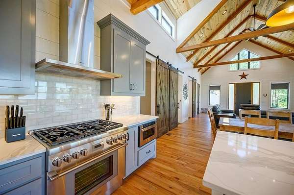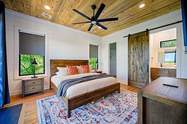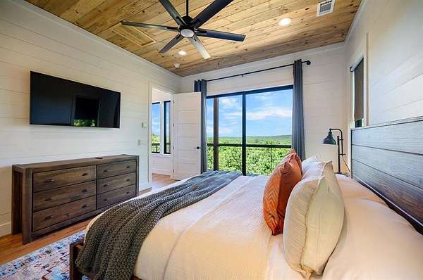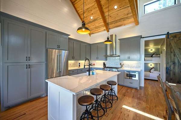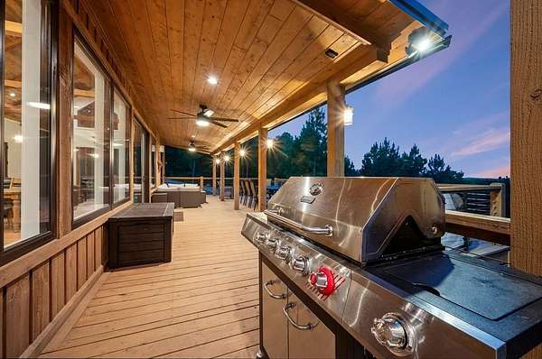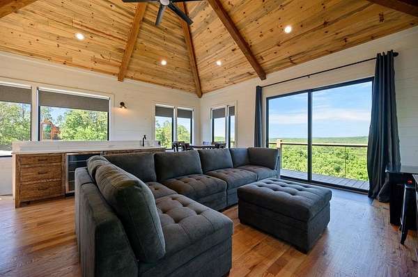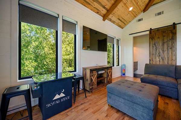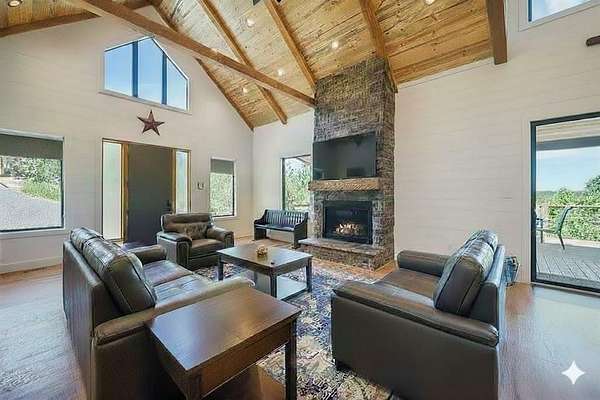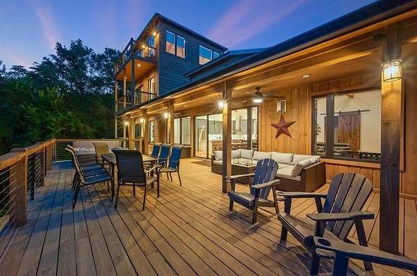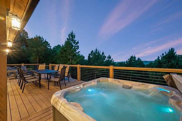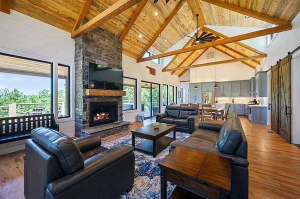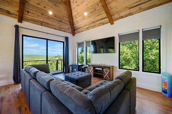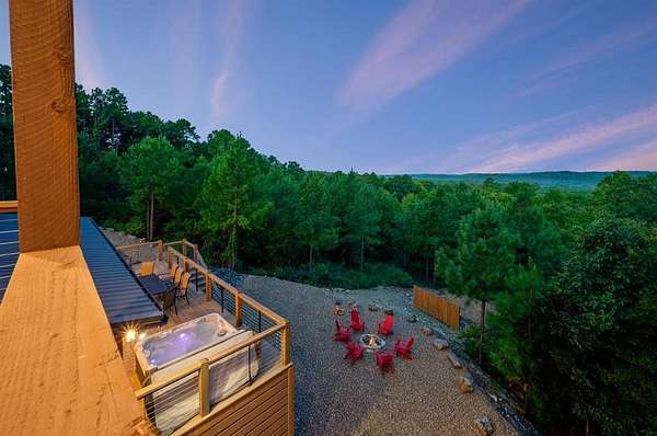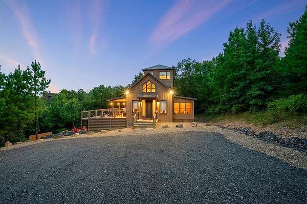 STR home for sale in Broken Bow, Oklahoma. Located on 2 private acres, Skyfall Lodge is a stunning custom-built luxury cabin offering the perfect balance of comfort, style, and seclusion. Designed for both relaxation and entertaining, the open-concept living area features inviting seating centered around a grand stone fireplace, creating a warm and welcoming atmosphere. The gourmet kitchen is equipped with quartz countertops, premium Thermador stainless steel appliances, generous prep space, and everything needed for effortless hosting. An outdoor hot tub enhances the experience, providing year-round relaxation and enjoyment. The cabin offers three bedrooms and three and a half bathrooms, including two main suites and a bunk room with four Twin XL beds and a private full bath-ideal for hosting large groups. The main suites, located on both the first and second floors, feature king-size beds, luxury linens, oversized walk-in closets, spa-inspired bathrooms, and direct access to the deck/ private balcony. The third-floor loft/game room includes its own bathroom, refrigerator, and balcony with spectacular views to the western horizon. The expansive deck is quiet and secluded, surrounded by a mix of pine and native hardwoods. Located in the prestigious Woodland Bluffs development, and was completed in late 2024 by a renowned local builder. The screened-in porch features beautiful wooded ceilings, adding to the cabin's refined rustic charm. This property offers ample space for a future pool or additional outdoor amenities. Just minutes from Beavers Bend State Park, Broken Bow Lake, hiking trails, fly fishing, boating, dining, and local attractions, Skyfall Lodge is ideally positioned for outdoor enthusiasts and vacationers alike. From peaceful mornings on the deck to evenings around the firepit, this exceptional property delivers a true Broken Bow cabin experience.
