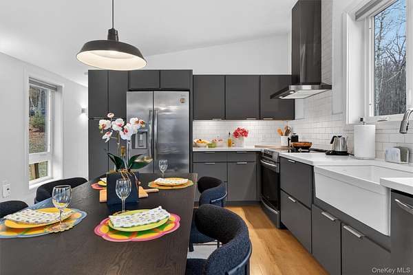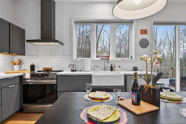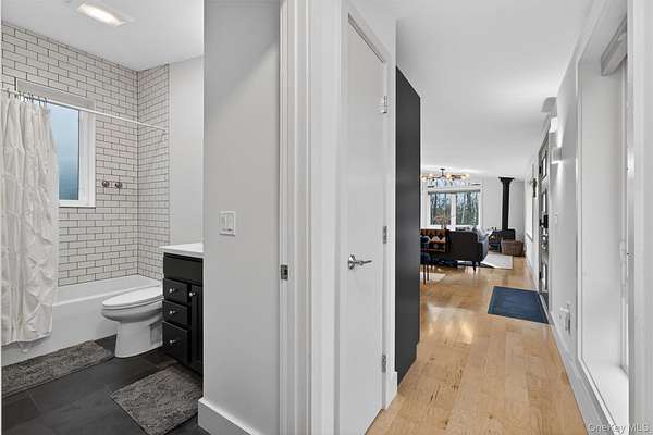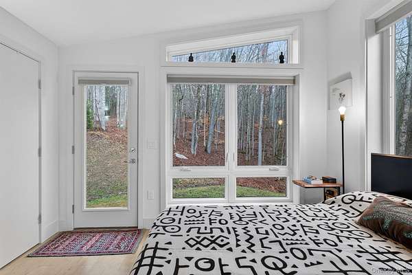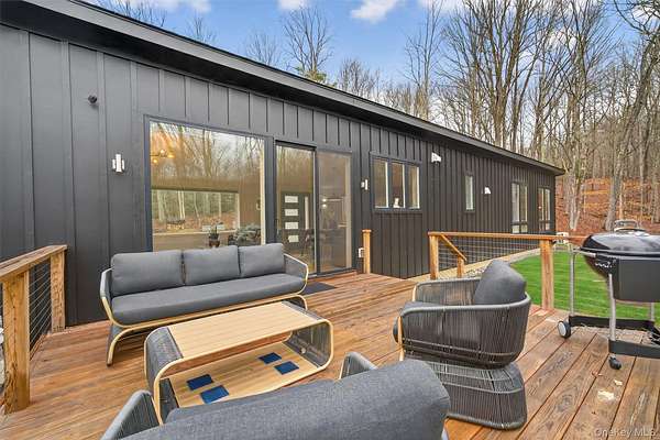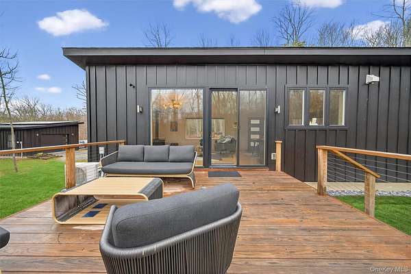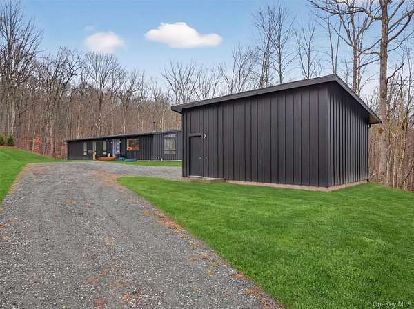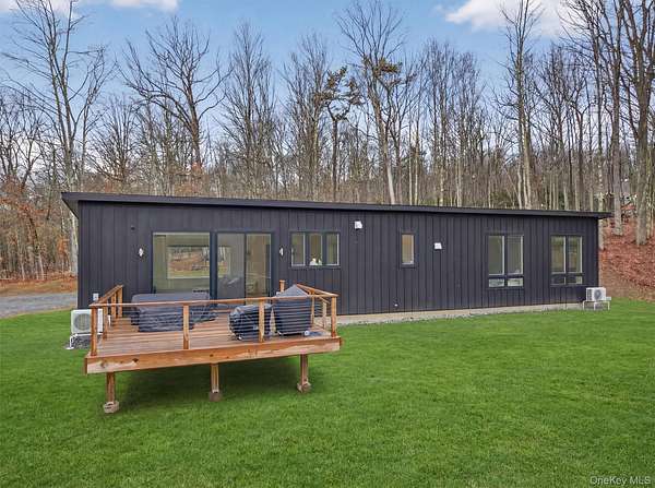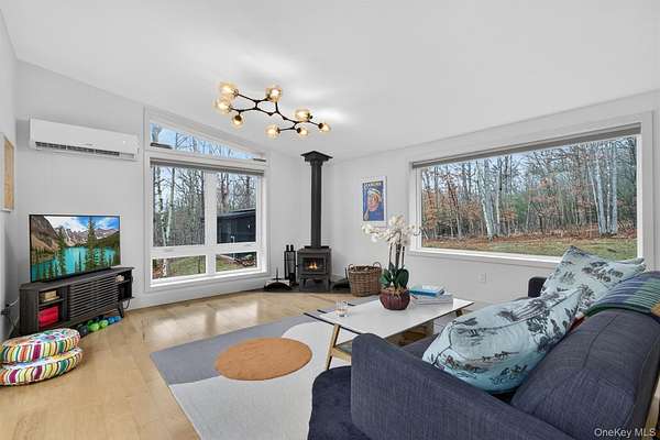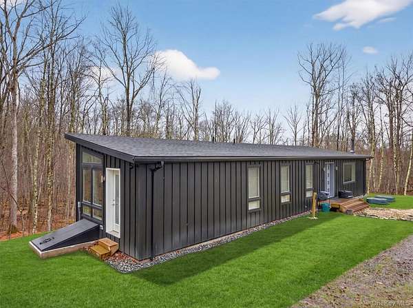 Modern midcentury aesthetic getaway on 6.34 quiet acres designed with clean, minimalist features. Built by Catskill Energy Homes with up-to-date building methods combined with the latest energy saving technologies to create a sustainable home for today's modern living. With 2BR/1bath, the spacious open concept feeling with large energy efficient windows provides lots of natural light and brings in the outdoors along with the cantilevered 16'x16' deck to "extend" the living area with outdoor enjoyment. The home features quality finishes like Hardi board siding,hyper insulated exterior walls, interior insulated sound proof walls, energy efficient appliances, high speed internet, Moen faucets, oversized farm sink, woodburning stove, split units for A/C & heating, maple hardwood floors, raised flower beds. New one car garage with electric car charge set-up, roof solar panels, owner owned and transfer with the sale. Not 10min to Narrowsburg&Callicoon for dining&shopping, minutes to Delaware River and Skinners Falls, Cochecton Pumphouse & Firehouse, 15 min to Bethel Woods Performing Ctr. 2hr to NYC!
