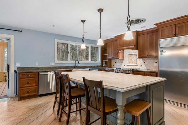 Spacious contemporary home with 3 bedrooms, plus bonus room, and 4.5 baths. Ideally situated on 2+ acres with views of the meadow and pond. You'll absolutely love the state-of-the-art kitchen featuring granite countertops, a large island, walk-in pantry, professional-grade gas range, custom tile backsplash, and two dishwashers. The open layout flows into a dining area and continues to an expansive living room with vaulted ceilings and a beautiful fireplace as the focal point. The first-floor primary suite offers a generous walk-in closet and two separate baths for convenience. Two more bedrooms, each with its own bath, and a bonus room are on the lower level. You'll also find a family room filled with natural light in the walkout lower level. Additional highlights include a home office, whole-house generator, direct entry from the 2-car garage, a screened porch, and large wraparound deck. Located just minutes from I-89, this property provides easy access to the Upper Valley and Dartmouth-Lake Sunapee Region. The area offers year-round opportunities for outdoor recreation including kayaking, fishing, skiing, ice skating, and more. All this in a lovely country setting.