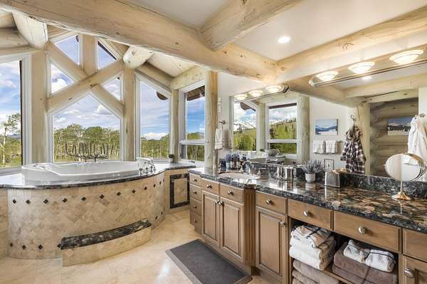 Welcome to your mountain sanctuary in the highly sought-after enclave of Mountain Village, CO. This exquisite 5-bedroom, 6.5-bathroom log home offers the perfect blend of rustic luxury and modern comfort, spread across a generous 7,225 square feet of living space and nestled on a private 2.45-acre lot.Crafted with timeless log architecture and extensively remodeled in 2017, this estate showcases elevated finishes, modern systems, and refined mountain style. Soaring vaulted ceilings, exposed beams, and grand stone fireplaces create a warm, inviting atmosphere, while expansive windows frame breathtaking views of the San Juan Mountains.The spacious kitchen is equipped with high-end appliances and custom cabinetry, offering a warm and functional space for hosting and daily living.