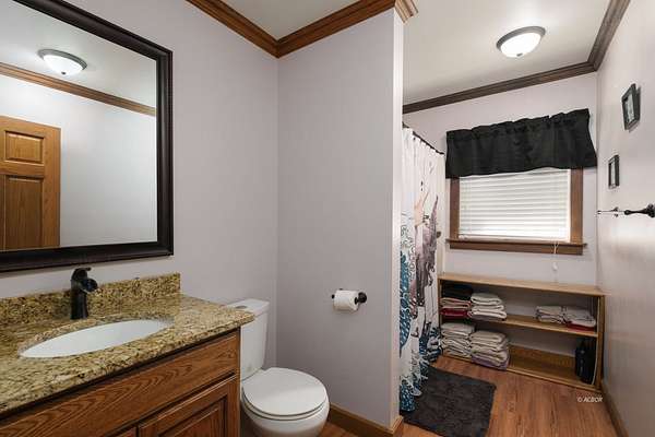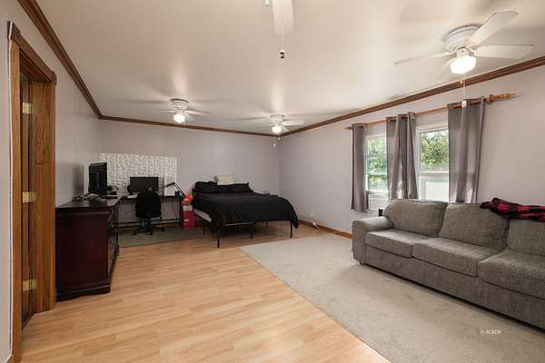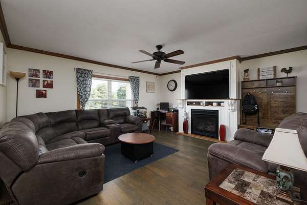 - Attic Fan(s), Carpet Flooring, Ceiling Fans, Gas Fireplace, Granite Countertops, Laminate Countertops, Wood Burning Stove, Wood Flooring