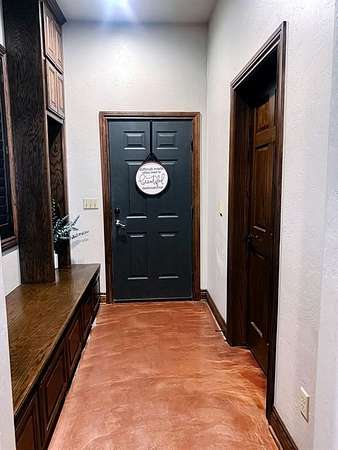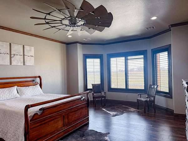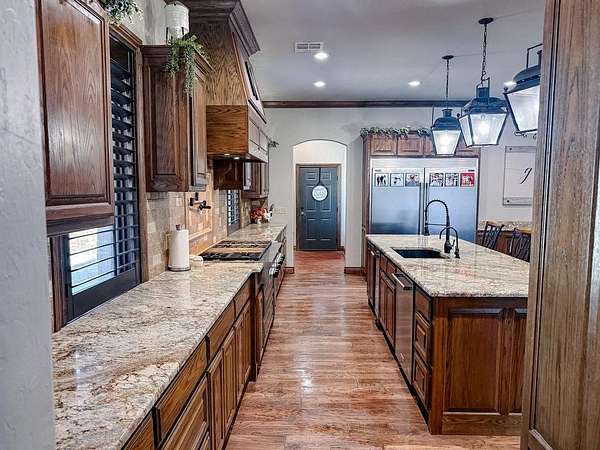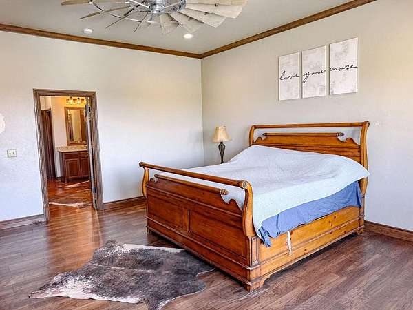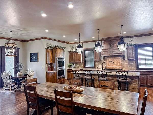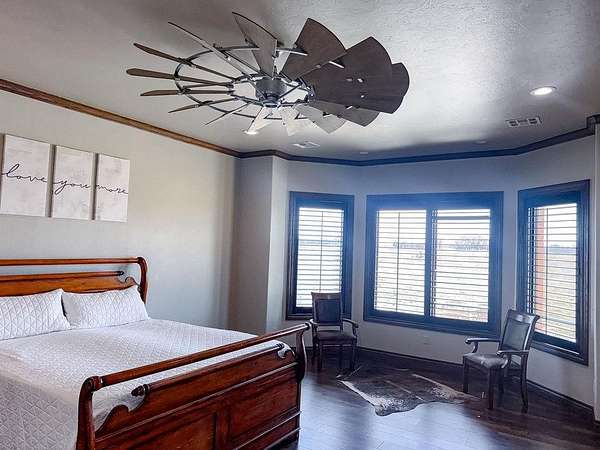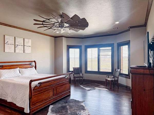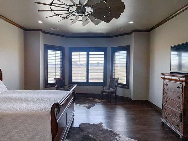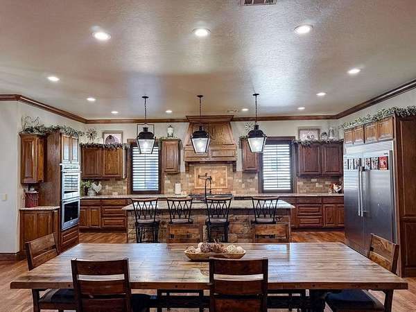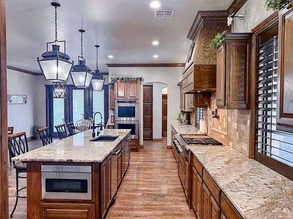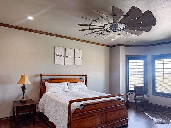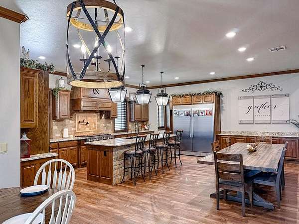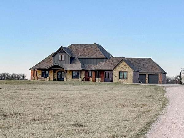 This Grand Place in BECKHAM COUNTY is out of this world with High End Class. It's a 4 BED/ 41/2 Bath, Nestled into 40 acres. It has the seclusion you want. Enjoy the sound of the wind blowing through the trees and the Western Oklahoma sunsets. Your breath is taken away at the beauty of this custom TWO STORY brick and stone home. It has a detached garage and also a 3 car garage. Come with me to behold the semi-spiral staircase that is showcased with the twisted wrought iron leading up to the upper level where there are two suites that have walk-in closets and full bathrooms as well as a washer and dryer. Let's float our minds downstairs below a large windmill fan for the OPEN living room, dining, and kitchen. The Cabinets are all custom with gorgeous GRANITE tops. Featuring Double Ovens, Massive Frig, Trash Compactor, Microwave, Dishwasher, Gas Stovetop, and Vent. Off the kitchen, you have an entrance that comes in from out by the detatched garage and has OAK BUILT INS for backpacks and shoes, etc. with a mudroom/pantry that has a sink and place for another frig and storage of your larger appliances. On the other side of this MASSIVE, CUSTOM Kitchen, you have Oak cabinets with HOOKS for coats and Bridals, etc. This room leads right into your 3 CAR GARAGE and also into the Mother-in-law SUITE. Large WALK-IN SHOWER AND TOILET CLOSET, SEPARATED by a long double sink, custom vanity. The PRIMARY BED AND BATH is Located on the opposite side of the home with large SOAK TUB and HUGE, CUSTOM closet. The Downstair's LAUNDRY ROOM has BUILT IN CABINETS and SINK for washing out and soaking stains. You can have a gift wrapping station or craft closet cozied in near the half bath and OFFICE. What more can you want!!!! This HOME also comes with an ABOVE GROUND STORM SHELTER to keep you safe during those Stormy Nights. You have CUSTOM blinds that you can LET NATURAL LIGHT FILTER IN or shut them for privacy. Have it YOUR WAY out here on the BACK FORTY.