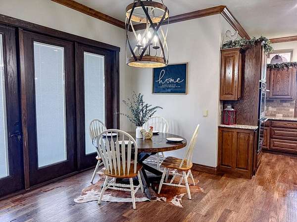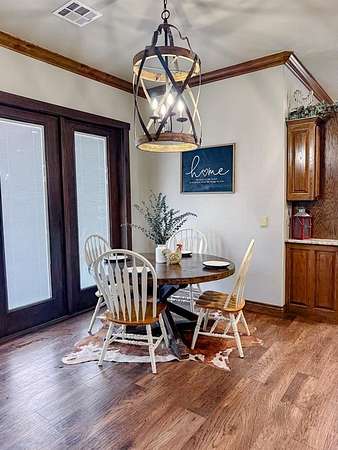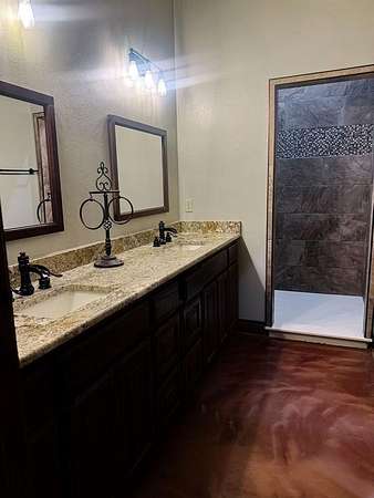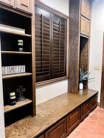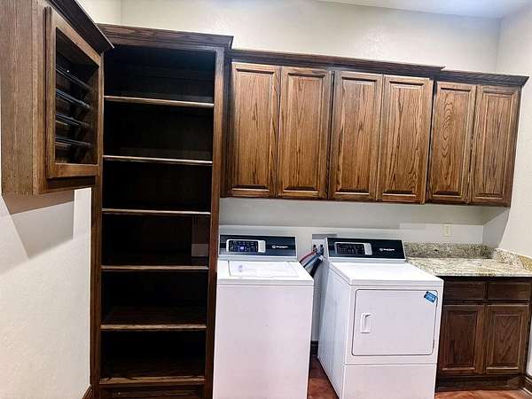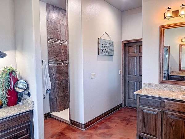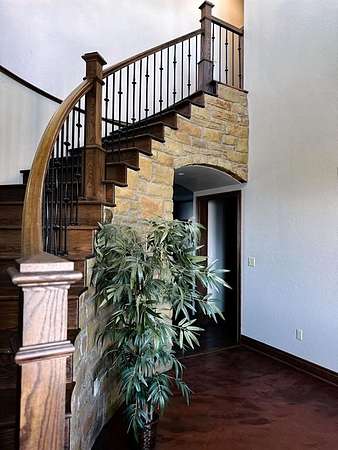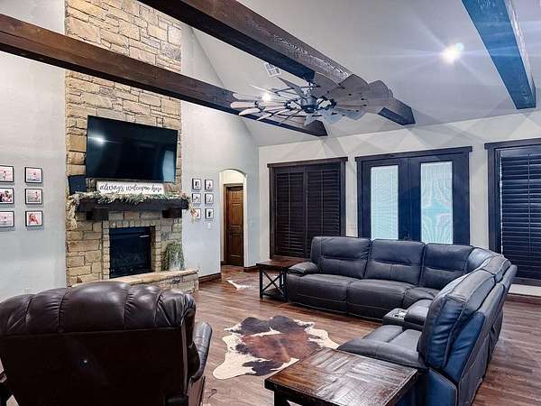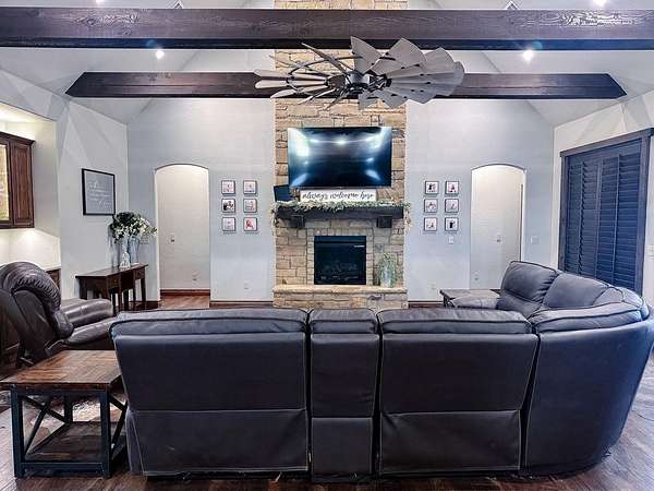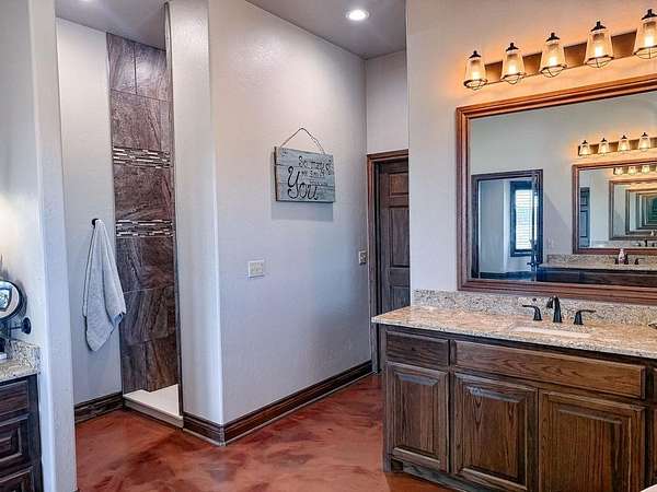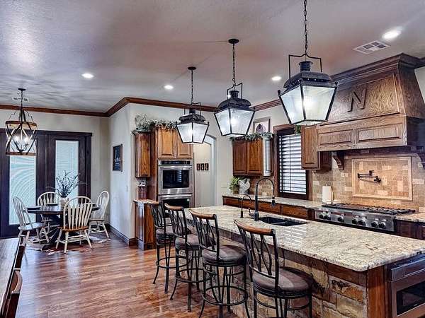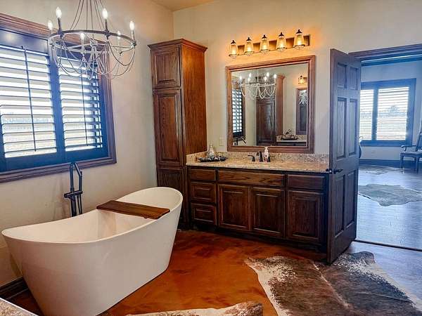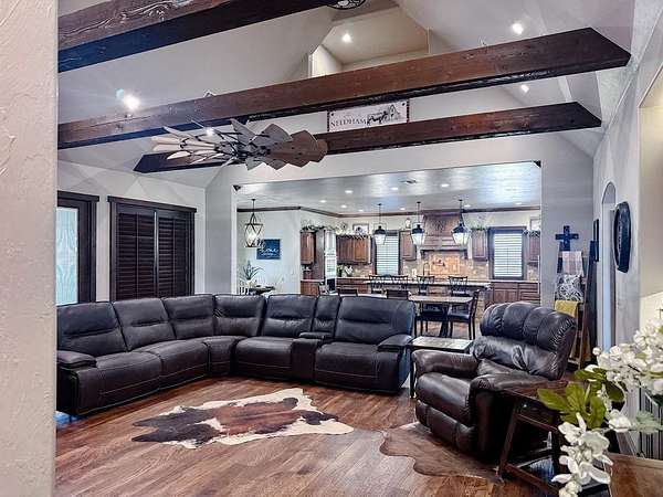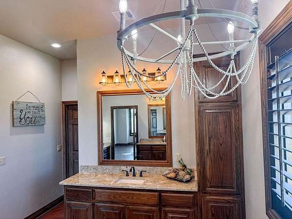 This Grand Place in BECKHAM COUNTY is out of this world with High End Class. It's a 4 BED/ 41/2 Bath, Nestled into 40 acres. It has the seclusion you want. Enjoy the sound of the wind blowing through the trees and the Western Oklahoma sunsets. Your breath is taken away at the beauty of this custom TWO STORY brick and stone home. It has a detached garage and also a 3 car garage. Come with me to behold the semi-spiral staircase that is showcased with the twisted wrought iron leading up to the upper level where there are two suites that have walk-in closets and full bathrooms as well as a washer and dryer. Let's float our minds downstairs below a large windmill fan for the OPEN living room, dining, and kitchen. The Cabinets are all custom with gorgeous GRANITE tops. Featuring Double Ovens, Massive Frig, Trash Compactor, Microwave, Dishwasher, Gas Stovetop, and Vent. Off the kitchen, you have an entrance that comes in from out by the detatched garage and has OAK BUILT INS for backpacks and shoes, etc. with a mudroom/pantry that has a sink and place for another frig and storage of your larger appliances. On the other side of this MASSIVE, CUSTOM Kitchen, you have Oak cabinets with HOOKS for coats and Bridals, etc. This room leads right into your 3 CAR GARAGE and also into the Mother-in-law SUITE. Large WALK-IN SHOWER AND TOILET CLOSET, SEPARATED by a long double sink, custom vanity. The PRIMARY BED AND BATH is Located on the opposite side of the home with large SOAK TUB and HUGE, CUSTOM closet. The Downstair's LAUNDRY ROOM has BUILT IN CABINETS and SINK for washing out and soaking stains. You can have a gift wrapping station or craft closet cozied in near the half bath and OFFICE. What more can you want!!!! This HOME also comes with an ABOVE GROUND STORM SHELTER to keep you safe during those Stormy Nights. You have CUSTOM blinds that you can LET NATURAL LIGHT FILTER IN or shut them for privacy. Have it YOUR WAY out here on the BACK FORTY.
