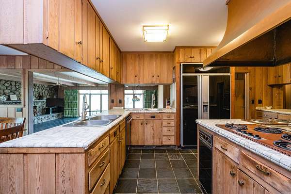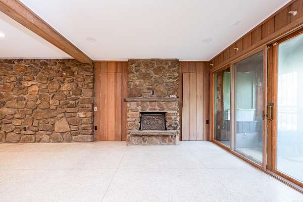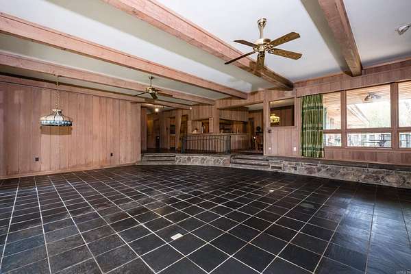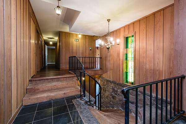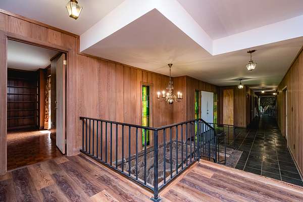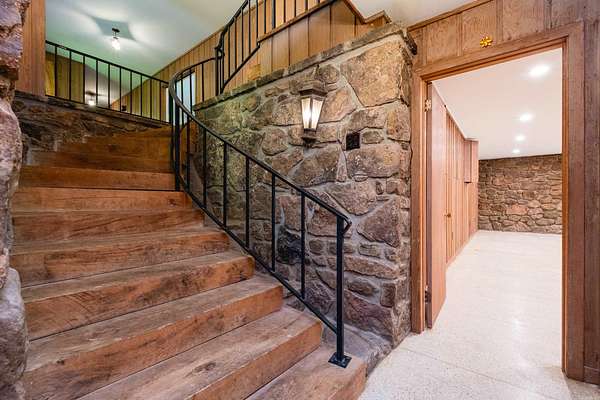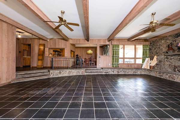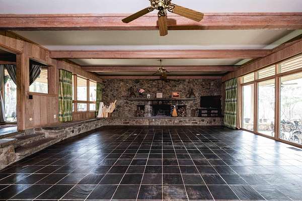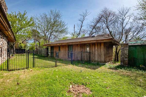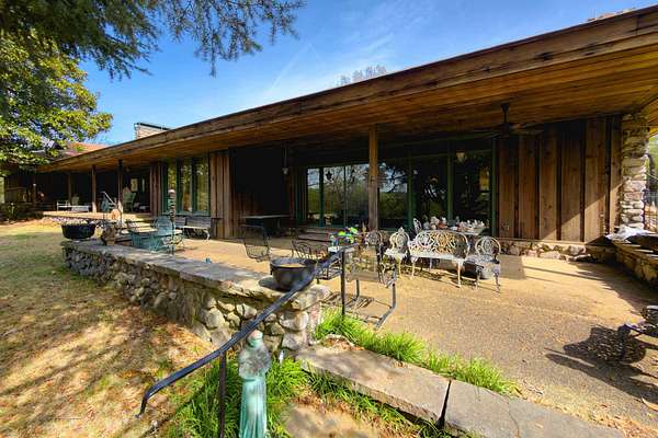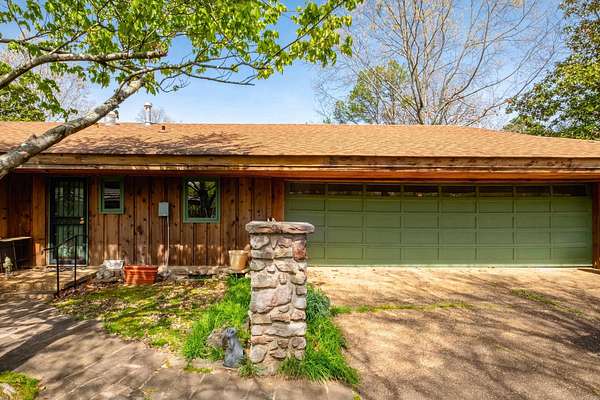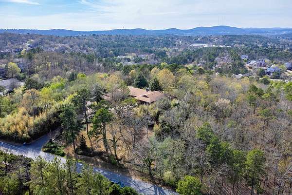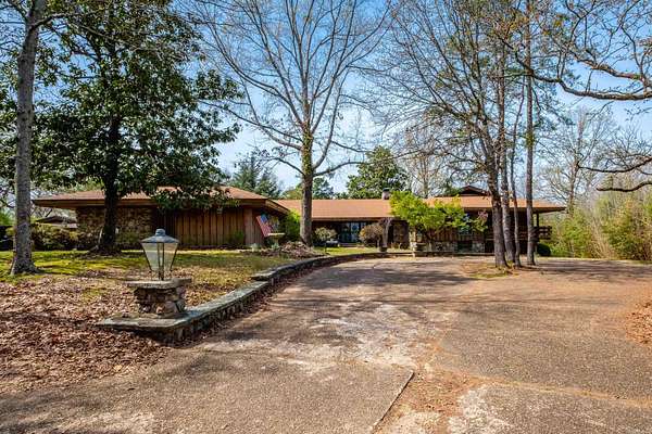 Distinctive mid-century modern home set on 7.7 acres with a gated drive, built under advisement of noted Arkansas architect E. Fay Jones, offering 5 bedrooms and 5.5 baths. The rock and frame exterior welcomes you into a center hall with slate floors and rock flanked circular staircase to lower level. A formal living room with fireplace, built-ins, and sliding doors opens to a covered patio and flows to the formal dining room. The spacious Den/family room features wood-beamed ceilings, an impressive rock fireplace, and outdoor access. Oversized kitchen includes bar area, pantry, double ovens, a large central island with grill and dual cooktops, plus an informal dining area. Laundry and office/craft room as well. The primary suite is expansive with a dual layout bath, walk-in shower, tub and generous closet space. Two additional bedrooms share a bath and deck access. Lower level leads to a bonus game room with wet bar, fireplace, and outside access, along with two bedrooms, each with a private bath. Covered porches and decks, an outbuilding/potting shed, and a large garage with storage complete the property. Truly one of a kind. Come see!