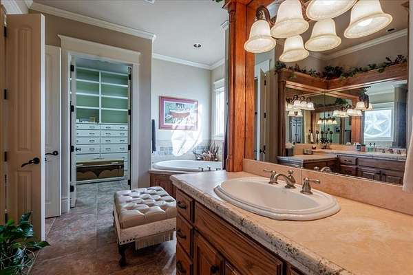 The primary suite offers a private retreat with a spa-like bath including a soaking tub, walk-in shower, dual vanities, and a spacious custom closet with built-ins. Two additional bedrooms are connected by a Jack-and-Jill bath with ample storage and classic shutters.