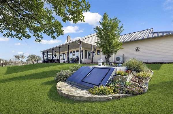 The custom rock home features 3 bedrooms, 2 and half bathrooms, and an inviting open-concept design with vaulted ceilings, exposed wood beams, hand-scraped hardwood floors, and a stunning stone fireplace. The kitchen is built for both everyday living and entertaining, complete with granite countertops, custom cabinetry, propane range, and an oversized walk-in pantry. Large windows throughout bring in natural light and showcase scenic views of mature trees, native grasses, and open pasture.