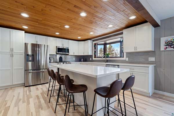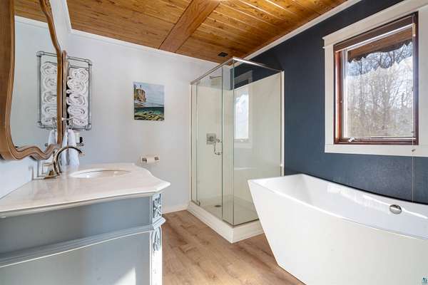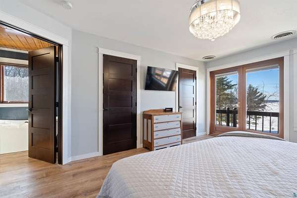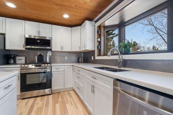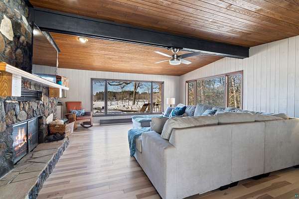 An extraordinary opportunity on Lake Nebagamon — 24.9 private acres with an incredible 819 feet of shoreline. The sunsets are amazing!! This completely and meticulously renovated home offers luxury, privacy, and year-round recreation in one unforgettable package. Inside, the stunning kitchen shines with brand-new quartz countertops, updated cabinetry, and modern appliances — thoughtfully designed for both everyday living and entertaining. The primary suite is a true retreat, featuring dual(His & Hers) walk-in closets and a spa-inspired ensuite bath reminiscent of a five-star resort. Step outside and experience nearly two miles of private trails winding through your own park-like setting. The groomed, level yard provides expansive space for gatherings, recreation, or simply soaking in the peaceful surroundings. Enjoy evenings on the decks or relax on the new paver patio complete with an in-ground firepit and custom fire ring overlooking the water. While a lightly traveled road sits between the home and the lake, access is seamless from the end of the driveway, leading to your sandy-bottom beachfront and private dock — ideal for swimming, boating, and lakeside lounging. Lake Nebagamon is renowned for exceptional year-round fishing and recreation, making this property perfect for all seasons. A newly installed circular blacktop driveway provides convenient access to the impressive 60x30 outbuilding, which includes a 30x20 shop and a detached two-car garage. Brand new main floor bathroom. Brand-new boiler/Water heater combo. Brand-new, high-efficiency forced-air furnace. Luxury. Acreage. Shoreline. Privacy. This is lake living at its finest.