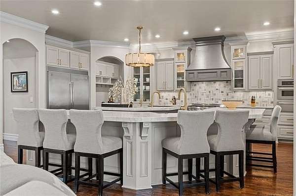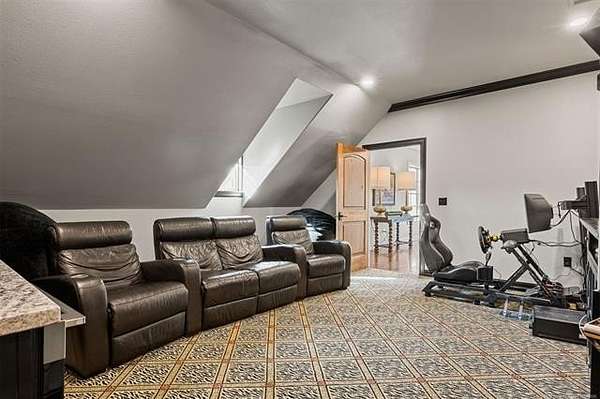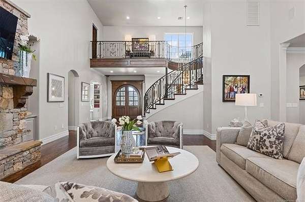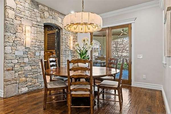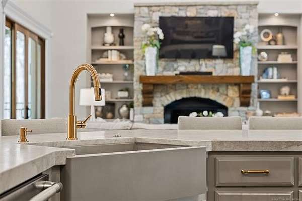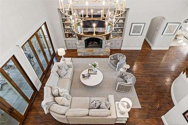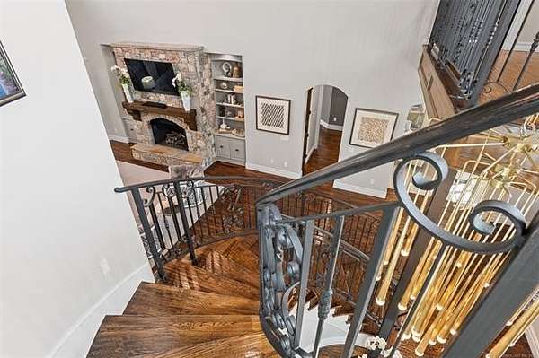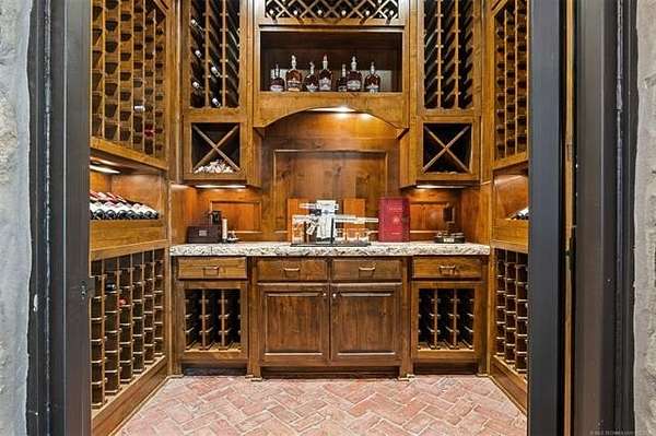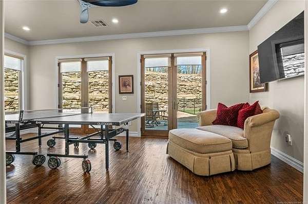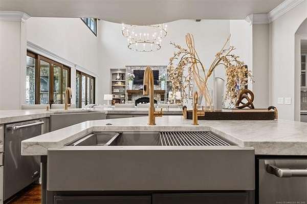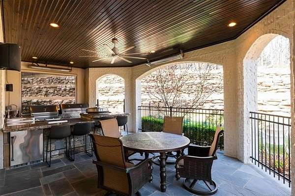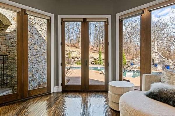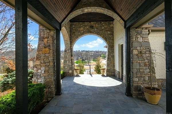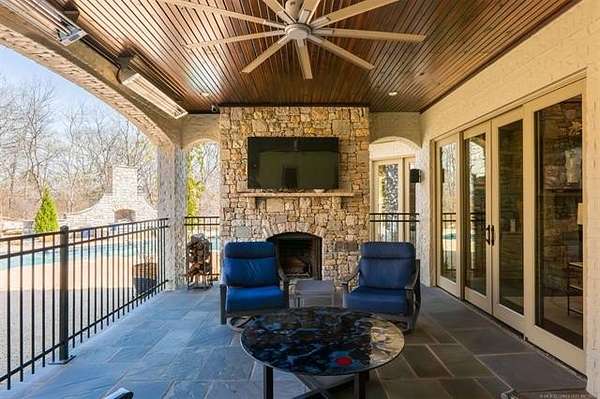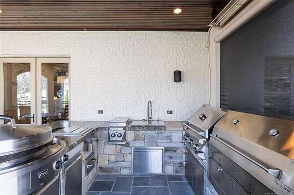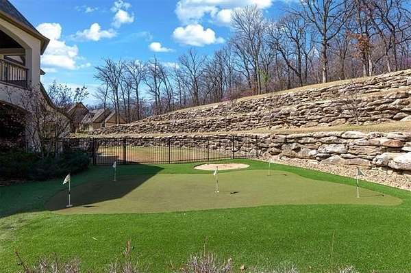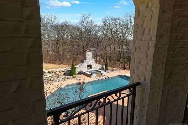 Situated on five elevated and beautifully manicured acres within the exclusive gated Featherstone community in the highly sought-after Jenks School District, this exceptional estate offers a rare blend of luxury, privacy, and resort-style living just minutes from Tulsa. This luxury home features five bedrooms, six full bathrooms, one half bath, and multiple living spaces designed for both everyday comfort and entertaining. The fully remodeled chef's kitchen showcases Taj Mahal quartz countertops, designer backsplash, updated fixtures and hardware, prep sink, dual built-in refrigerators, dual dishwashers, ice machine, wine refrigerator, and an expansive pantry with additional prep space. A striking wine cellar with wrought iron door and stacked stone sits just off the breakfast nook, creating an elegant focal point. The home offers four living areas including the main living room, a dedicated theater room with built-in wet bar, microwave, and refrigerator, a downstairs game room that opens to the outdoor living spaces (could be 6th bedroom) and a third-level exercise or flex space. The luxurious primary suite features a private exterior entrance with pool views, spa-style bath, large bathtub & shower enclosure, double sinks, built-in vanity, and spacious his-and-her closets. Hand scraped hardwood floors run throughout with carpet only in the theater, complemented by updated paint, fixtures, hardware and designer lighting. Outdoor living is unmatched with five separate spaces, four exterior fireplaces, a gunite pool with tanning ledge and bubbler, eight-person spa, pool bath, and a fully equipped outdoor kitchen with two grills, EVO cooktop, burners, sink, and refrigerator. A five-hole putting green with sand trap enhances the entertainment. The four-car garage includes epoxy floors and an in-ground safe room. Tankless hot water and a new roof complete this extraordinary offering.
