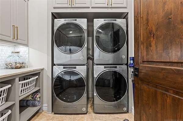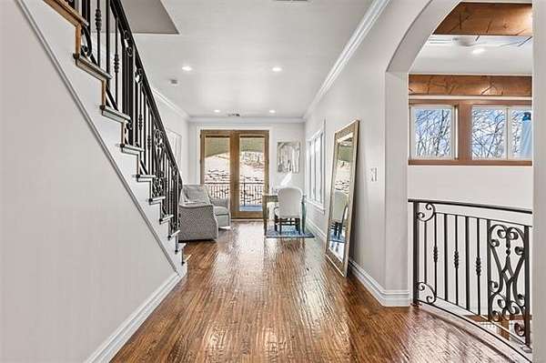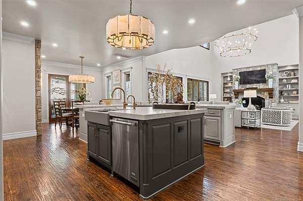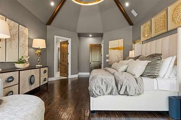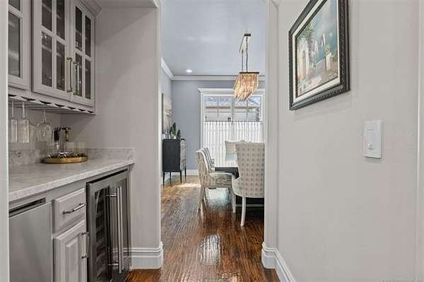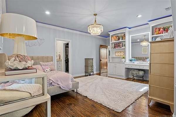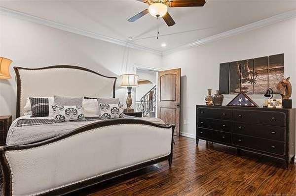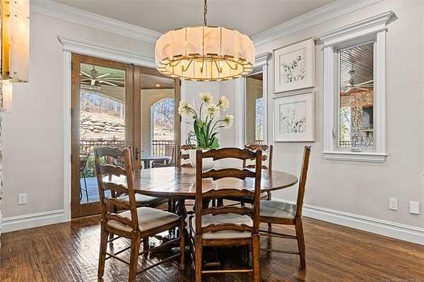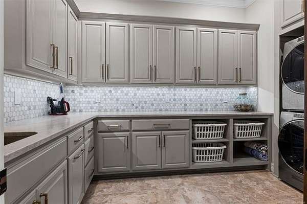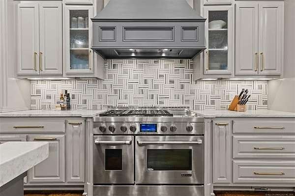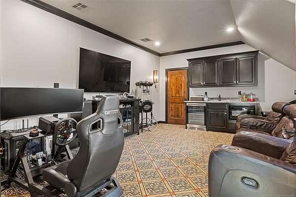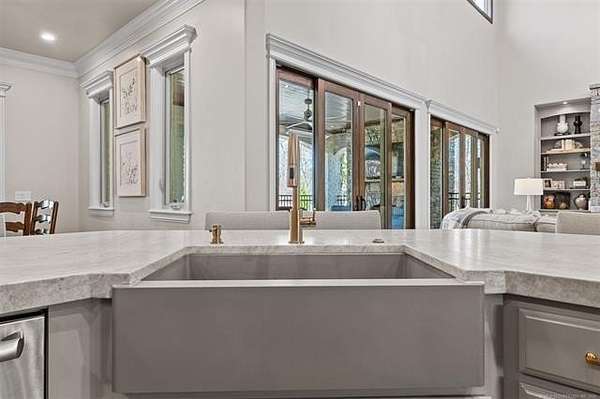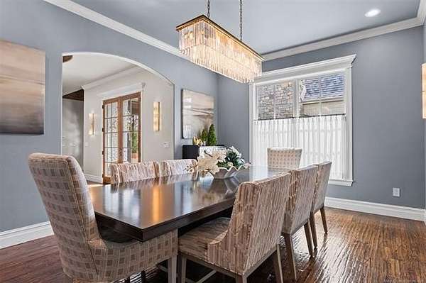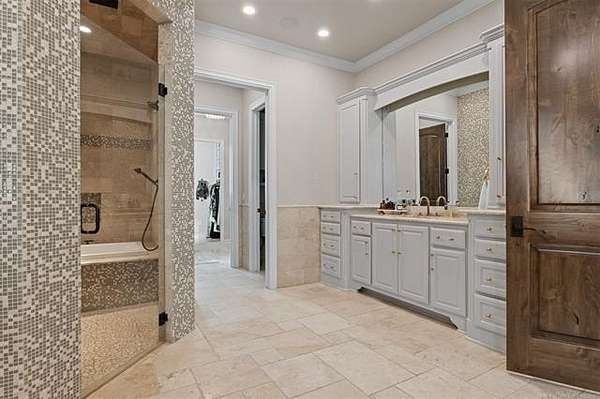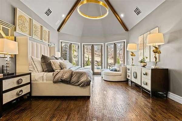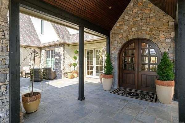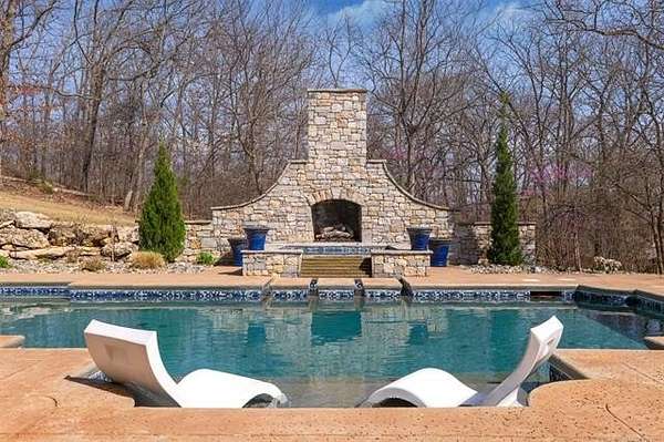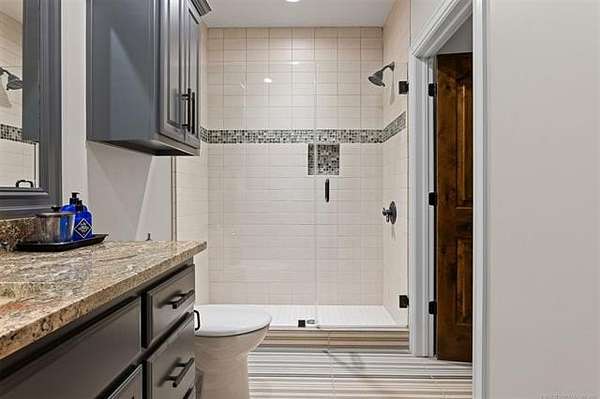 Situated on five elevated and beautifully manicured acres within the exclusive gated Featherstone community in the highly sought-after Jenks School District, this exceptional estate offers a rare blend of luxury, privacy, and resort-style living just minutes from Tulsa. This luxury home features five bedrooms, six full bathrooms, one half bath, and multiple living spaces designed for both everyday comfort and entertaining. The fully remodeled chef's kitchen showcases Taj Mahal quartz countertops, designer backsplash, updated fixtures and hardware, prep sink, dual built-in refrigerators, dual dishwashers, ice machine, wine refrigerator, and an expansive pantry with additional prep space. A striking wine cellar with wrought iron door and stacked stone sits just off the breakfast nook, creating an elegant focal point. The home offers four living areas including the main living room, a dedicated theater room with built-in wet bar, microwave, and refrigerator, a downstairs game room that opens to the outdoor living spaces (could be 6th bedroom) and a third-level exercise or flex space. The luxurious primary suite features a private exterior entrance with pool views, spa-style bath, large bathtub & shower enclosure, double sinks, built-in vanity, and spacious his-and-her closets. Hand scraped hardwood floors run throughout with carpet only in the theater, complemented by updated paint, fixtures, hardware and designer lighting. Outdoor living is unmatched with five separate spaces, four exterior fireplaces, a gunite pool with tanning ledge and bubbler, eight-person spa, pool bath, and a fully equipped outdoor kitchen with two grills, EVO cooktop, burners, sink, and refrigerator. A five-hole putting green with sand trap enhances the entertainment. The four-car garage includes epoxy floors and an in-ground safe room. Tankless hot water and a new roof complete this extraordinary offering.