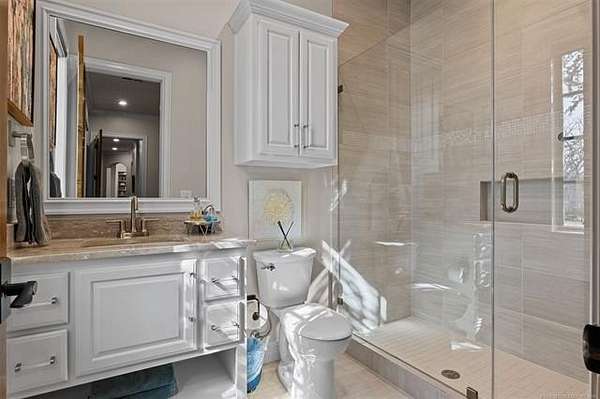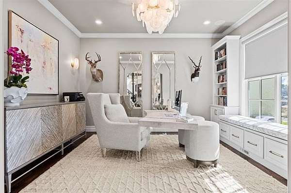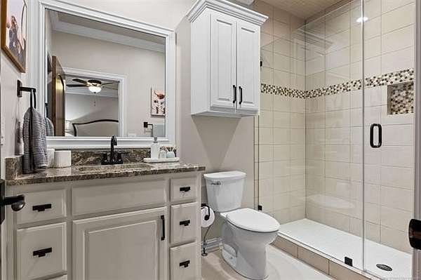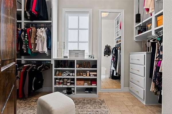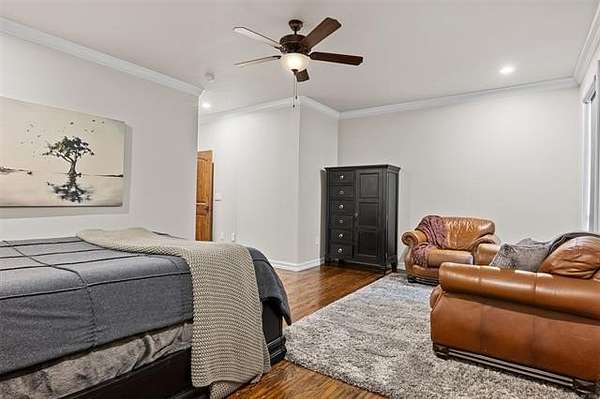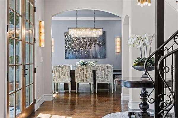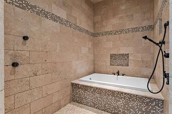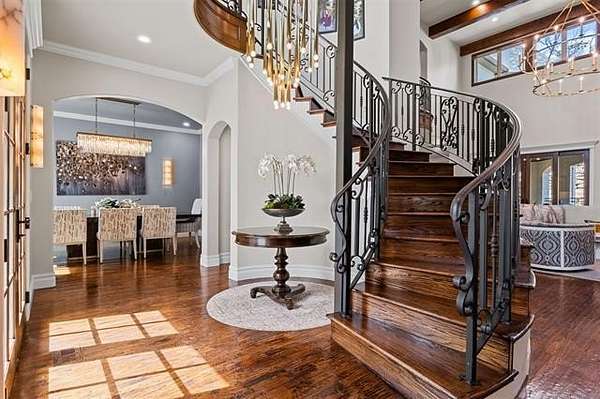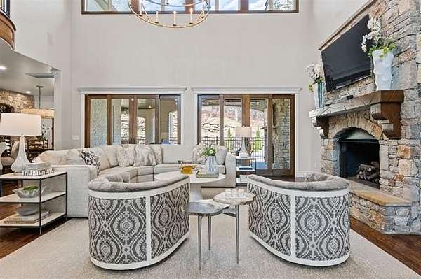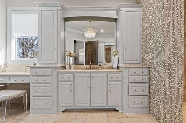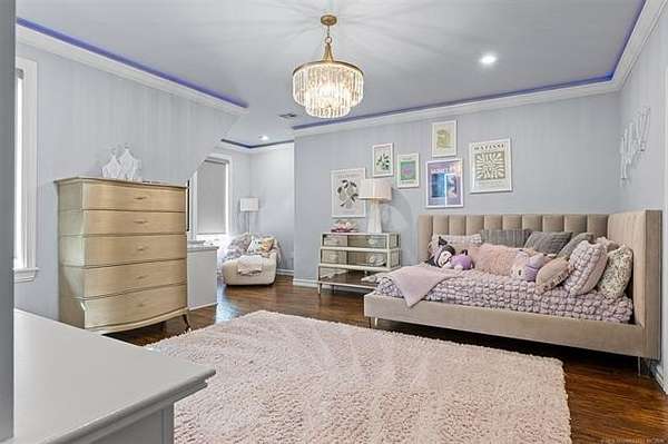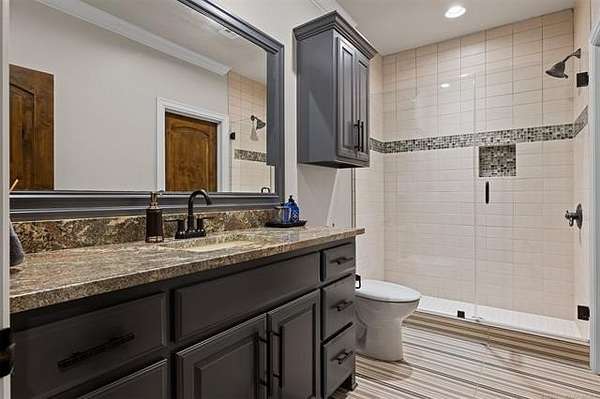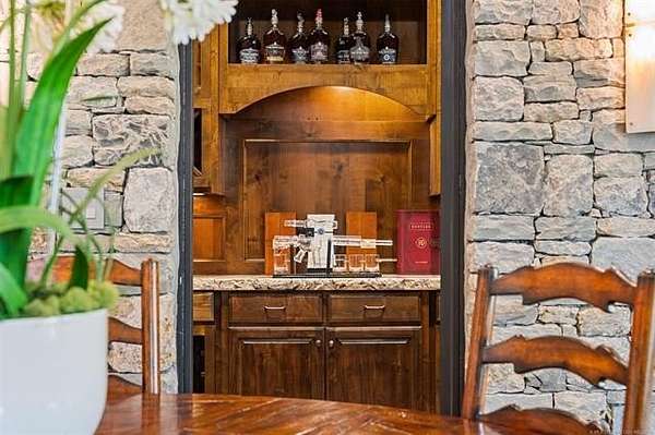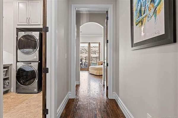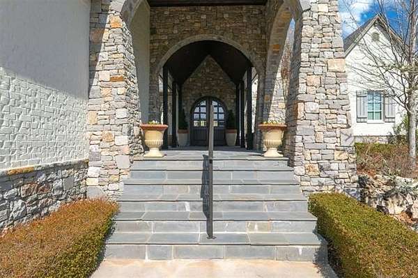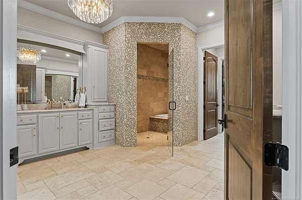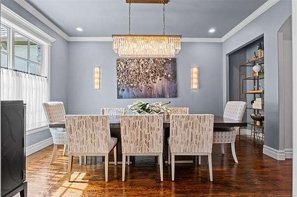 Situated on five elevated and beautifully manicured acres within the exclusive gated Featherstone community in the highly sought-after Jenks School District, this exceptional estate offers a rare blend of luxury, privacy, and resort-style living just minutes from Tulsa. This luxury home features five bedrooms, six full bathrooms, one half bath, and multiple living spaces designed for both everyday comfort and entertaining. The fully remodeled chef's kitchen showcases Taj Mahal quartz countertops, designer backsplash, updated fixtures and hardware, prep sink, dual built-in refrigerators, dual dishwashers, ice machine, wine refrigerator, and an expansive pantry with additional prep space. A striking wine cellar with wrought iron door and stacked stone sits just off the breakfast nook, creating an elegant focal point. The home offers four living areas including the main living room, a dedicated theater room with built-in wet bar, microwave, and refrigerator, a downstairs game room that opens to the outdoor living spaces (could be 6th bedroom) and a third-level exercise or flex space. The luxurious primary suite features a private exterior entrance with pool views, spa-style bath, large bathtub & shower enclosure, double sinks, built-in vanity, and spacious his-and-her closets. Hand scraped hardwood floors run throughout with carpet only in the theater, complemented by updated paint, fixtures, hardware and designer lighting. Outdoor living is unmatched with five separate spaces, four exterior fireplaces, a gunite pool with tanning ledge and bubbler, eight-person spa, pool bath, and a fully equipped outdoor kitchen with two grills, EVO cooktop, burners, sink, and refrigerator. A five-hole putting green with sand trap enhances the entertainment. The four-car garage includes epoxy floors and an in-ground safe room. Tankless hot water and a new roof complete this extraordinary offering.