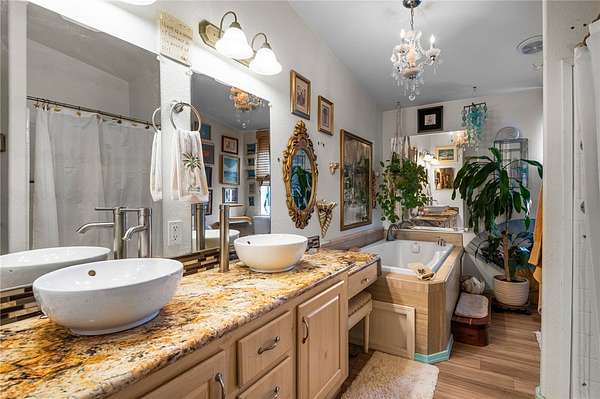 - Bathtub, Breakfast Bar, Ceiling Fans, Dining Area, Dual Sinks, Granite Counters, Jetted Tub, Kitchen Island, Open Floorplan, Primary Suite, Separate Shower, Tub Shower, Utility Room, Vaulted Ceilings, Walk In Closets