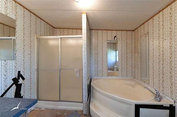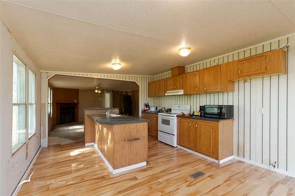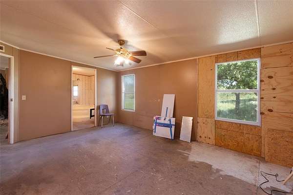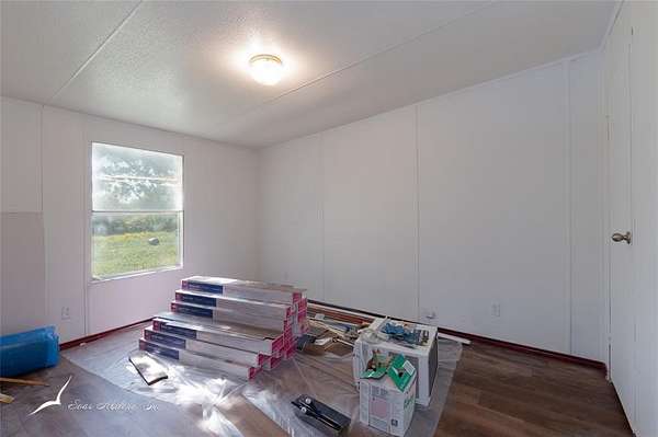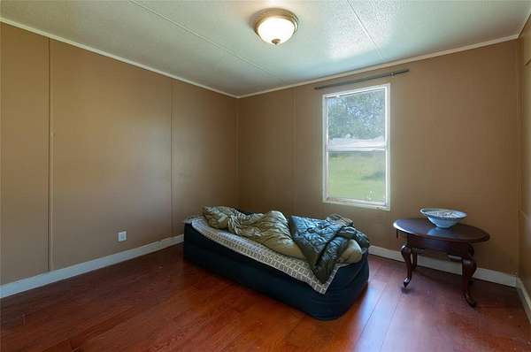 Improvements include a 2001 manufactured home (1,296 sq ft, 3 bed, 2 bath) with a solid metal roof. The home is in need of renovation; however, several thousand dollars' worth of new flooring and building materials will convey. Water and electric are connected, allowing buyers to move in during renovation.