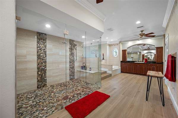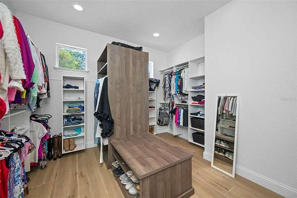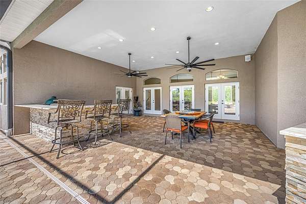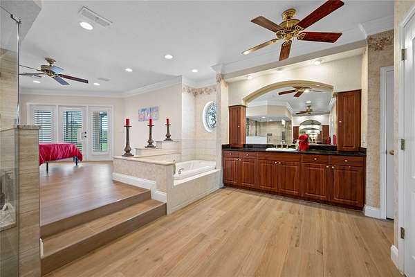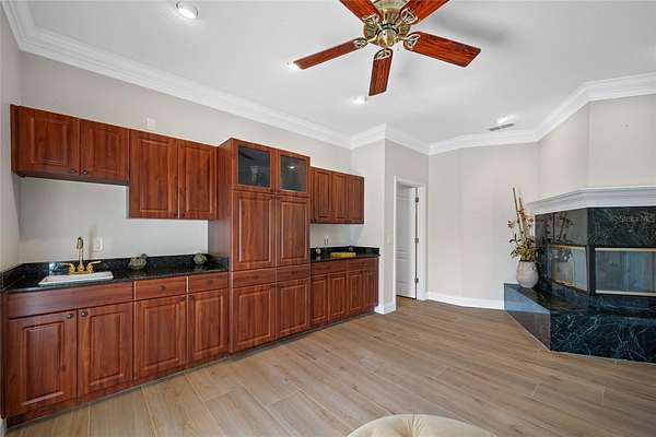- Built-In Features, Ceiling Fans(s), High Ceilings, Open Floorplan, Solid Wood Cabinets, Split Bedroom, Stone Counters, Walk-In Closet(s), Wet Bar, Window Treatments