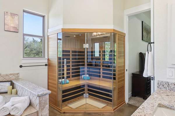 - Beamed Ceilings, Breakfast Bar, Built-In Features, Ceiling Fan(s), Ceiling-High, Double Vanity, Open Floorplan, Pantry, Primary Bedroom On Main, Sauna, Walk-In Closet(s), Wet Bar