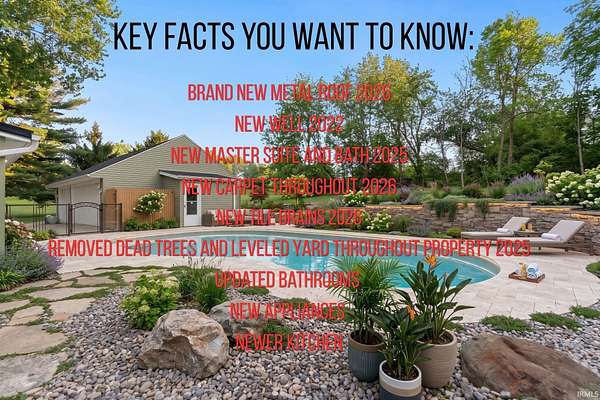 Start Showing Date: 4/29/2026 *OPEN HOUSE SUNDAY 5/3 3PM-5PM*Tucked away on over 5 beautiful acres in the charming town of Roanoke, this 4-bedroom, 4-bath home is where space, style, and location come together effortlessly.With over 2,200 square feet to spread out, you’ll love the fresh updates throughout—brand new carpet underfoot, a stunning updated kitchen ready for everything from busy mornings to holiday hosting, and a beautifully refreshed primary suite bathroom that feels like your own private retreat. A brand new metal roof adds both peace of mind and curb appeal.Step outside and the lifestyle really shines—endless room to roam, relax, and play, plus an inviting in-ground pool that’s just waiting for summer memories.All of this in a prime location with open enrollment into Southwest Allen County Schools, giving you flexibility and convenience while still enjoying the small-town charm Roanoke is known for.