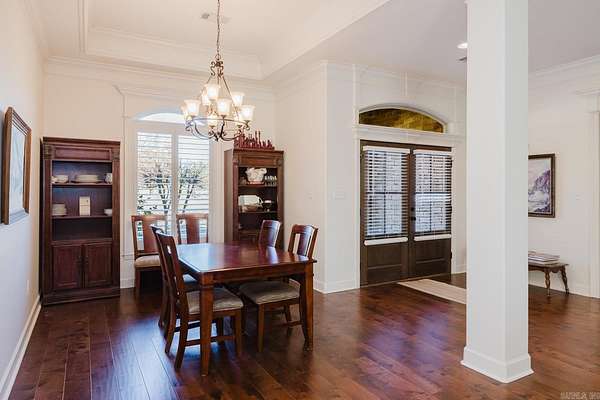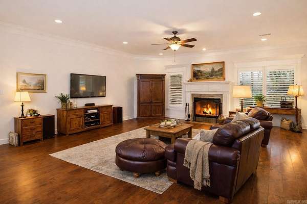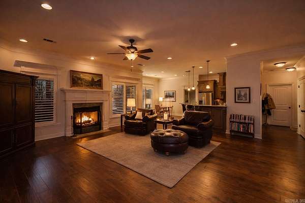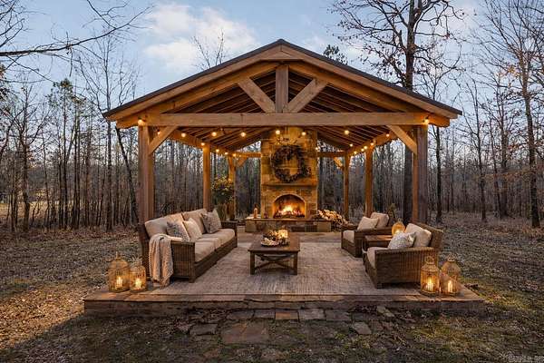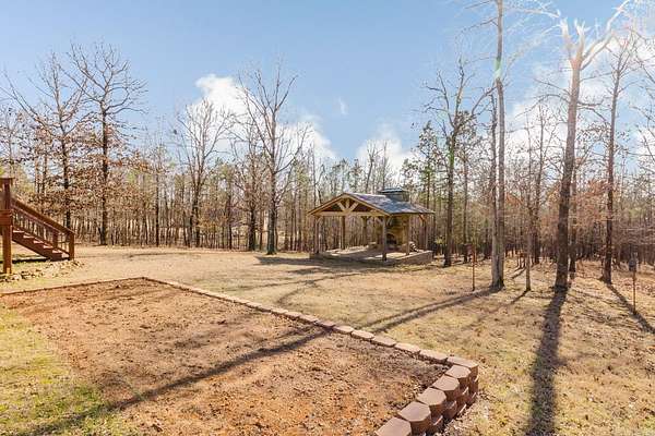 Set on 2.98 partially wooded acres in a beautiful gated neighborhood, this exceptionally maintained 4 bedroom, 3 bath, one-level home offers the perfect balance of privacy, space, and comfort. A desirable split floor plan provides added functionality, including a Jack-and-Jill bathroom connecting two secondary bedrooms. Rich hardwood floors, soaring ceilings, and elegant crown molding create a bright, inviting interior, while the open-concept layout flows seamlessly into a well-appointed kitchen for everyday living and entertaining. Step outside to your own private retreat, featuring a covered gazebo/pavilion with a stunning stone fireplace, perfect for year-round gatherings and relaxing evenings. The expansive acreage offers a peaceful, wooded backdrop while still providing usable outdoor space. Additional highlights include a three-car garage plus an additional detached garage/workshop, offering excellent storage and flexibility. Some photos have been digitally staged.