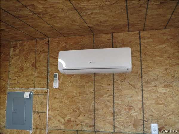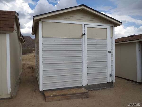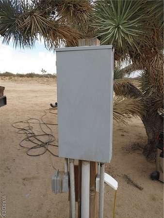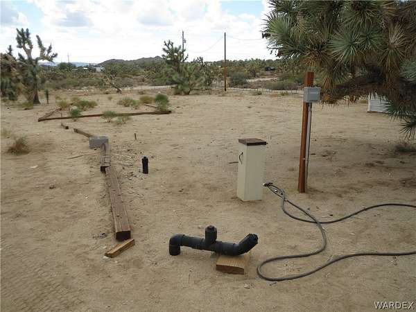 Price Reduced again on this great residential property with utility electrical power and septic system. The stunning mountain view setting is located among the Joshua trees at 2700 ft. elevation. The 2.35 Acre property perimeter is fenced and gated and fully cleared with 2 full RV hook up stations. The L shape one bedroom, one bathroom 400 Sq. Ft. stick built house includes kitchen with gas stove, large electric refrigerator and utility room with electric washer and dryer. Bathroom has a step in shower. House is on concrete foundation with trussed roof and 2 mini split AC units and is insurable. 5 storage sheds on the property. Water storage tank inside insulated building on concrete foundation with pump. Large 10 ft. by 30 ft. insulated storage building on concrete foundation with 110v and 240V 50 A receptacle and mini-split AC. Two insulated 8 ft. X 18 ft. storage buildings and two smaller 8 ft. X 8 ft. storage sheds. Three covered carports for vehicle parking. Property is set up for Water Delivery or Water Haul. Well has not been developed but well site is located behind the house. Satellite Dish system.
