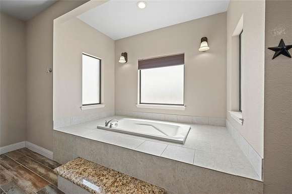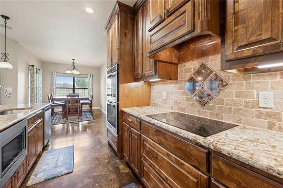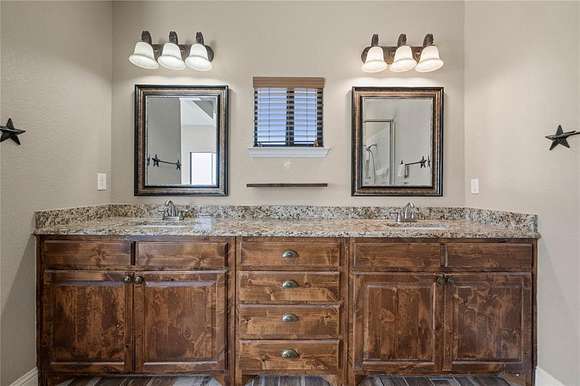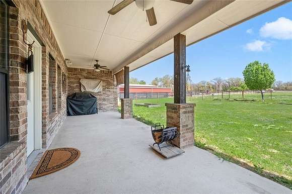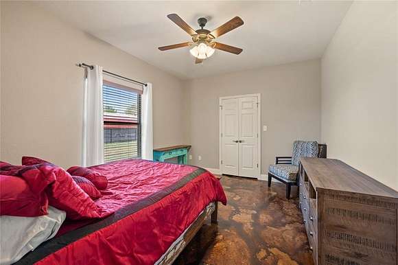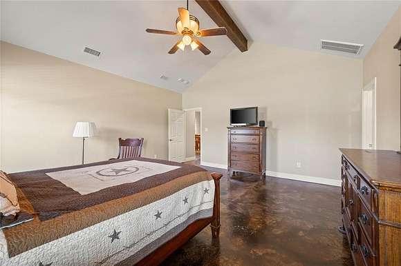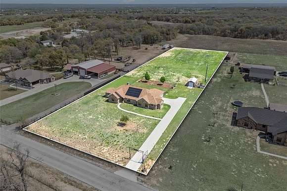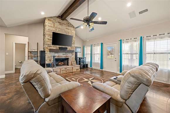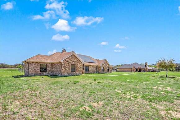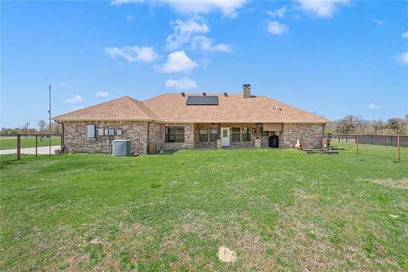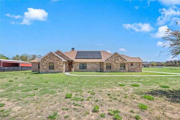 This is Country living at its finest! This gorgeous 2500 sq ft. home offers so many luxurious amenities including a solar panel roof to keep the Hot Texas summer electric bills at a bare minimum. You will be dazzled by the beautiful Texas sized Master bath with huge walk in shower with two separate shower heads. A glorious walk in separate bath tub and a large vanity. This home offers very attractive stained concrete flooring throughout, water softener and a reverse osmosis filtration system in the kitchen. Enjoy the beautiful sunsets from the oversized back covered patio with two overhead fans to keep you cool and refreshed and a TV as well. Entrance to the property contains an added security measure with a cross gate covering the very lengthy driveway. The magnificent kitchen with granite counter tops throughout offers a double oven for convenient large gathering holiday entertaining. The extensive open living room offers a gorgeous colossal sized bricked wood fireplace as the center piece for the entire home. Not to be outdone, this home is located on two beautiful acres of country style living with plenty of space for all types of family activities with No HOA! Also, a large shed with electricity sits near the rear of the home. This is a home to just kick back and enjoy!
