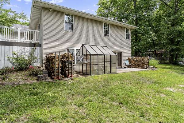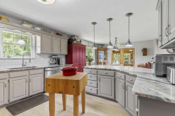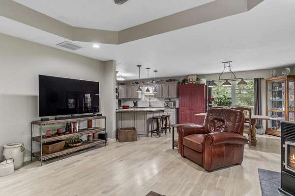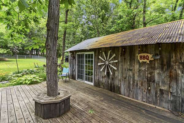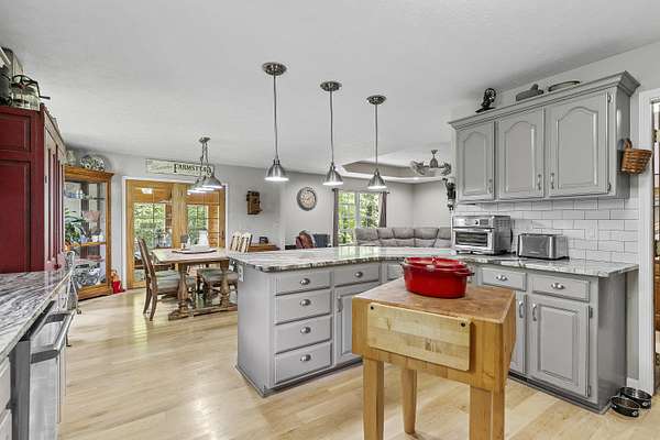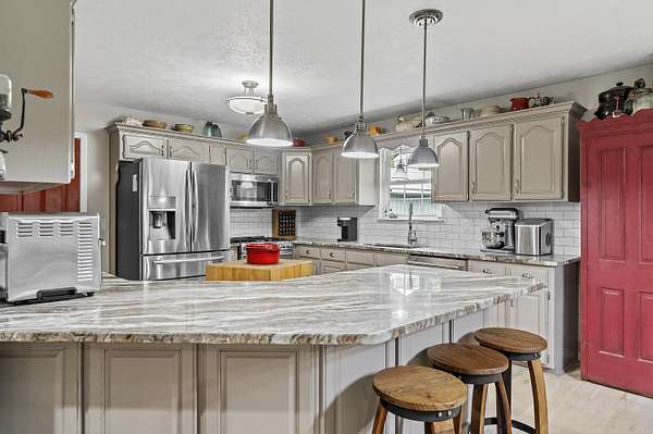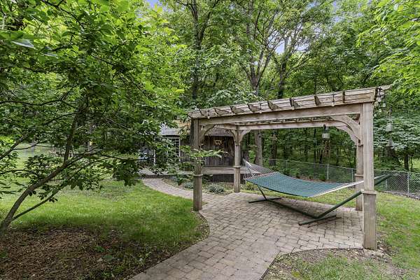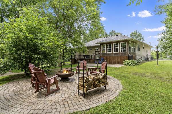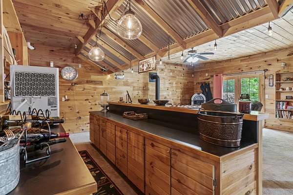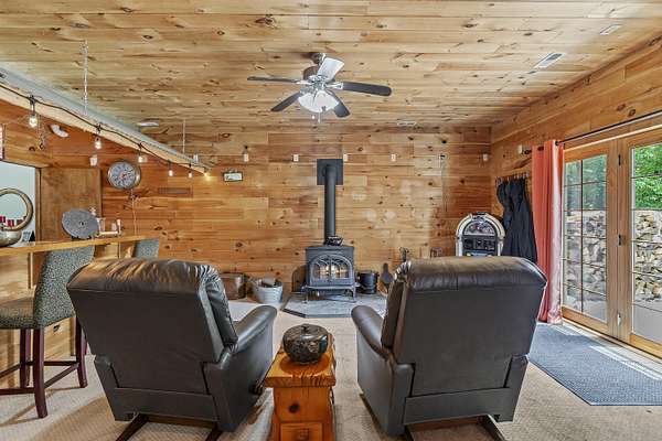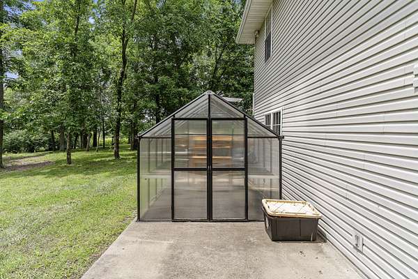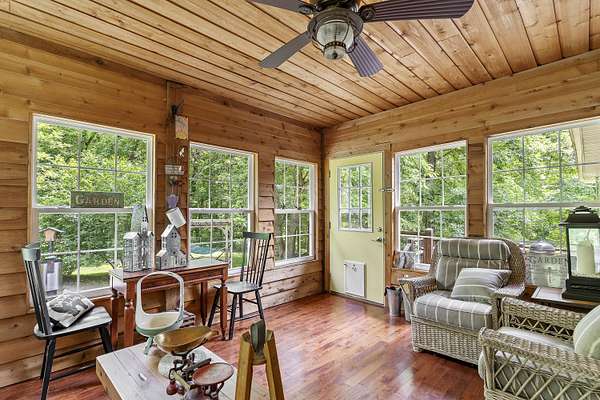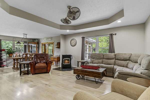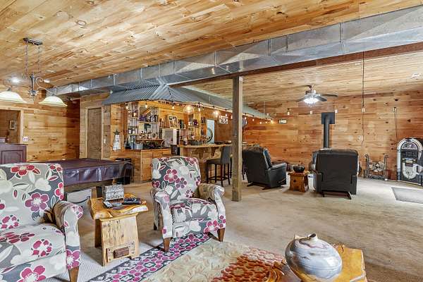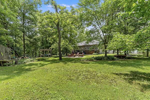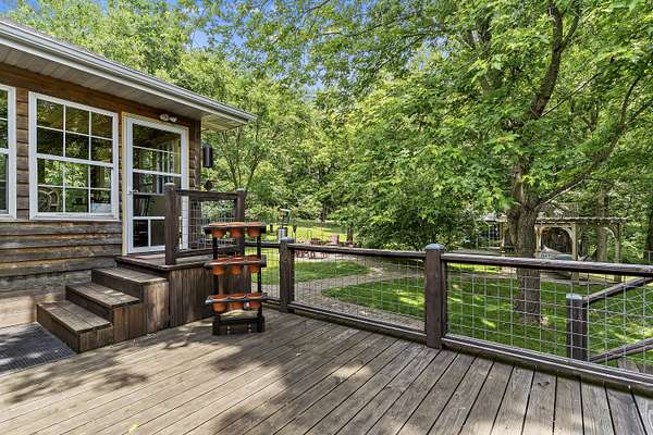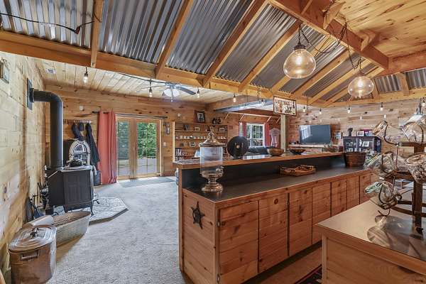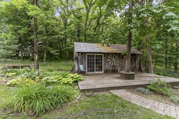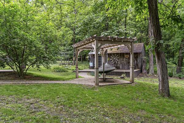 Nestled in a serene, park-like setting, this impressive 5-acre property features a spacious 3,636 sq ft walk-out basement home, a newer 24' x 32' shop equipped with 220V electric and concrete floors, plus another storage building. The main level of the home offers 3 bedrooms and 2.5 bathrooms, including a convenient main-level laundry room. The kitchen has been tastefully updated with new countertops, backsplash, sink, and modern appliances--including a microwave that doubles as a convection oven and an upgraded gas stove. The eating area extends into a sunroom, providing scenic views of the beautifully landscaped backyard. Downstairs, the fully finished basement boasts a wet bar, an additional bedroom and full bath, a spacious living room, and an extra room ideal for a gym, office, or storage. Stay cozy and energy-efficient in winter with a pellet stove on the main floor and a wood stove in the basement. To get you started, the seller is leaving 2 tons of pellets. This property is packed with extras including an RV gravel pad with a dedicated electrical receptacle, a generator disconnect, and a large, welcoming front porch upgraded with TimberTech composite decking. More outdoor features include a covered foot bridge crossing the wet-weather creek, a greenhouse, a pergola-covered patio, and well-maintained garden areas with large metal plant holders. Whether you're looking for inside comfort, or outdoor charm, this property really has it all!