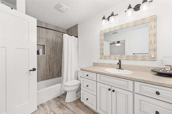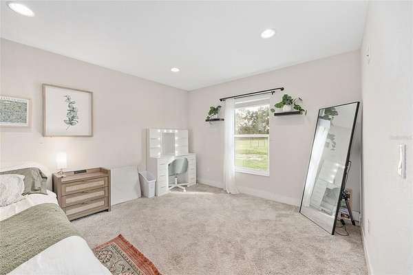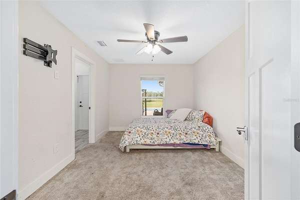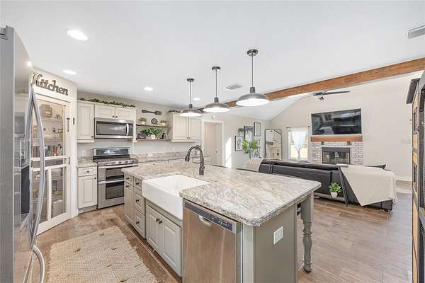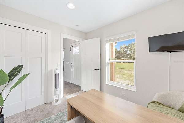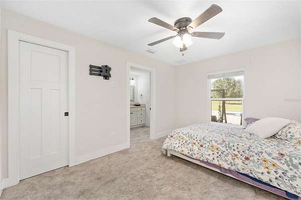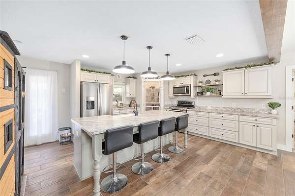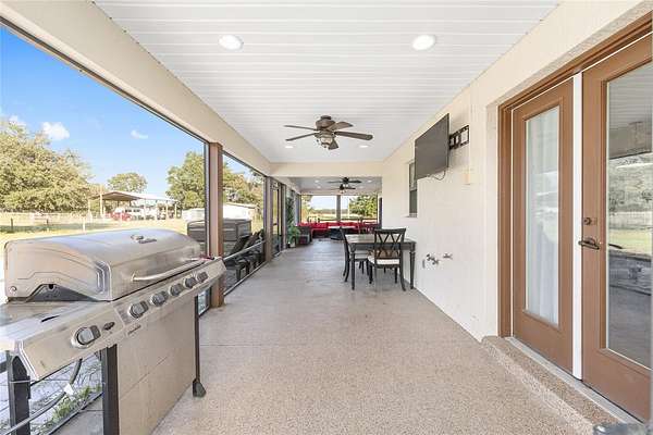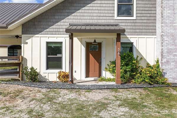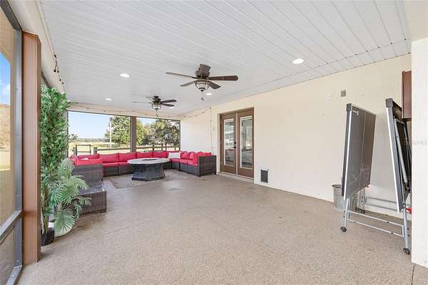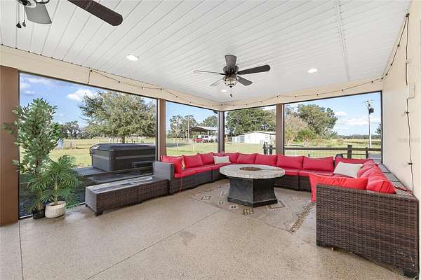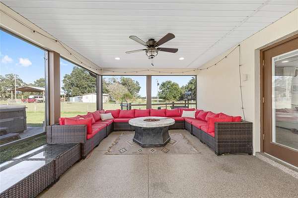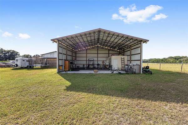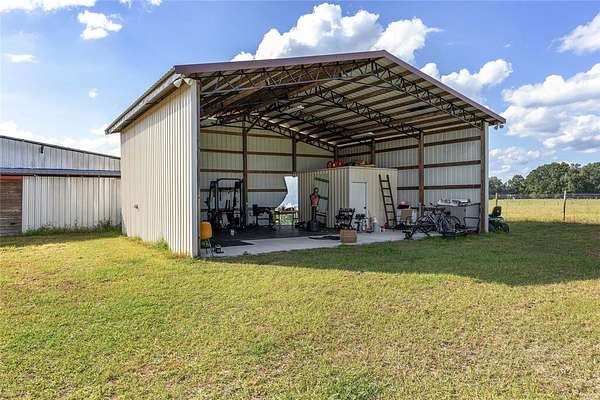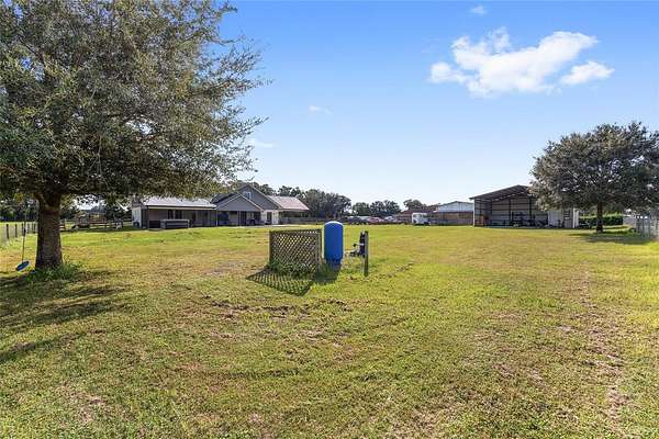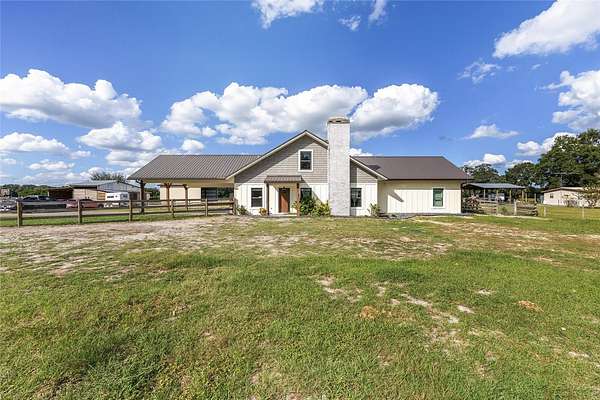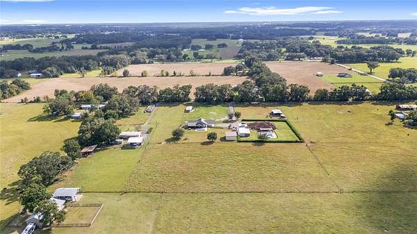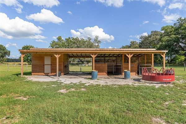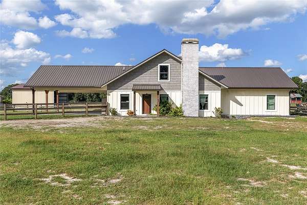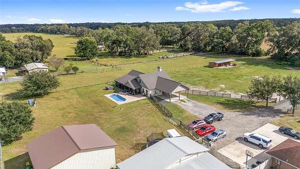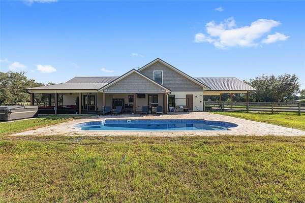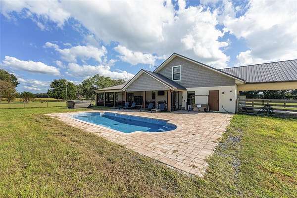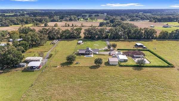 Welcome home to this mini farm country retreat! This custom-built Craftsman-style home sits on 2 peaceful acres and offers the perfect blend of elegance, comfort, and functionality. Inside, the open-concept design highlights a bright great room with a fireplace, perfect for relaxing or entertaining. The spacious kitchen features beautiful wood cabinetry, a large island, and plenty of workspace for cooking and gathering, truly the heart of the home. In addition to three bedrooms, there's a flex room that makes an ideal office, hobby room, or den, giving you options to fit your lifestyle. With two primary suites, each with its own en-suite bath and walk-in closet, plus a guest bedroom, there is space and privacy for everyone. Step outside to an expansive screened patio ideal for outdoor dining and gatherings, overlooking the sparkling pool and spa beyond. Enjoy the tranquil setting with an outdoor shower and fully fenced acreage, perfect for pets, horses, or simply peaceful country living. Equestrians and hobbyists will love the two-stall Amish-built stable with a tack room. At the same time, the 900 sq ft metal building offers incredible versatility, ideal for RV or boat storage, a workshop, or a studio. The home's metal roof, thoughtful craftsmanship, and serene surroundings make it both low-maintenance and high-quality. Located just 7 minutes from all The Villages has to offer, yet tucked in a quiet area that's central to several cities, this mini-farm delivers the best of both worlds: country serenity with modern convenience. Schedule your private showing today and experience peaceful, fenced-in Florida living at its finest!