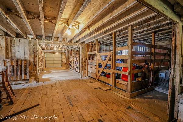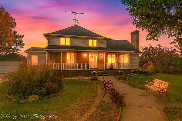 Experience the balance of country living on this scenic 20-acre farm featuring a 4-bedroom, 1.5-bath farmhouse. Upon entering, you'll be welcomed by a vaulted family room with floor-to-ceiling windows and lots of natural light, showcasing sweeping countryside views. A brick wood-burning stove adds both warmth and character to the space. The spacious country kitchen offers solid cabinetry, abundant natural light, a breakfast bar, and an eat-in dining area. Just off the kitchen is a versatile four-season mudroom-perfect for morning coffee, drying off pets, or unloading after a long day. The main level also includes a full bathroom and a home office for added flexibility. The second floor features four bedrooms, offering plenty of space for everyone-or the option to combine rooms to create a larger primary suite. A walk-up attic provides excellent additional storage. The lower level includes a game room, a recreation room with egress windows, a storage area, a workroom, and an extra fireplace flue. The basement also has rough-in plumbing ready for a second full bathroom. Outbuildings include a 90' x 34' five-stall barn with a 76' x 34' hay loft, 48' x 30' workshop with two 12' x 10' sliding doors, two poultry buildings, which are also ideal for gardening shed, storage, or hobby-farm livestock. Approximately 10 acres are currently rented as hay fields, and 2+ acres were previously planted with wine vines (2018), offering potential for a future vineyard, garden, or additional home site. Enjoy peaceful walking trails, wide-open skies, and the serene beauty of rural living. This property offers endless opportunities to live, work, and unwind in a truly picturesque setting. A beautiful farmhouse that has been family-owned since its original construction 100+ years.