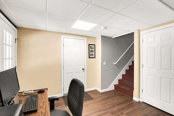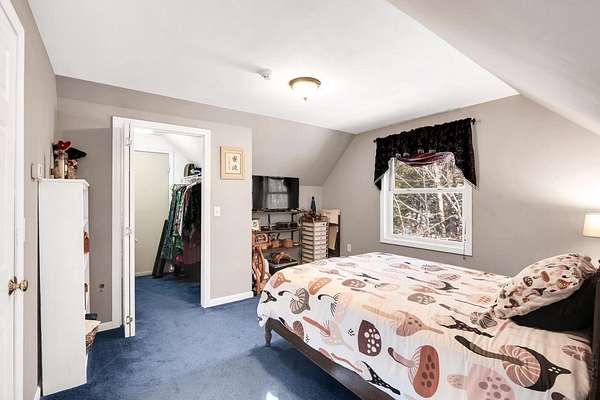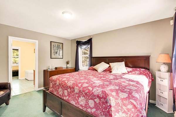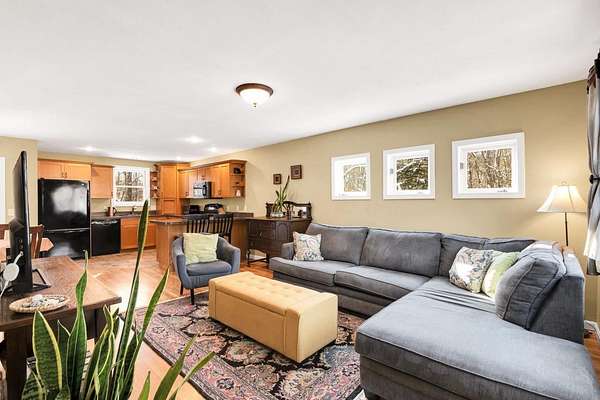 Delightful 3-bed, 3-bath, contemporary home set well back from the road on a private 1.8 acre wooded lot in a quiet neighborhood. The first floor features an open design with a large kitchen/dining/living space with beautiful red oak hardwood floors, maple hardwood kitchen cabinets, and sliders to a private deck overlooking the woods. First-floor primary bedroom en suite with hot tub, step-in shower, and walk-in closet. Two lovely bedrooms upstairs with a shared bathroom in between. Oversize windows throughout the home give a bright and sunny vibe, as well as soothing views of the surrounding woods. Bonus space in the walkout basement ideal for family room, office or game room. Fabulous front porch to enjoy your morning coffee or a good book. Built in 2000, this lovingly-maintained home is being offered for the first time by the original owners. Showings start with open houses Friday, 1/23, 3-5 PM; Saturday, 1/24, 10 AM - 1 PM: Sunday, 1/25, 10 AM - 12 PM.