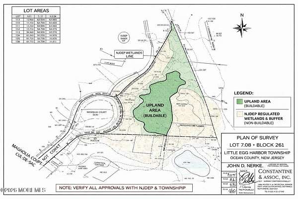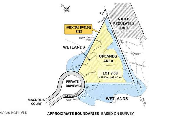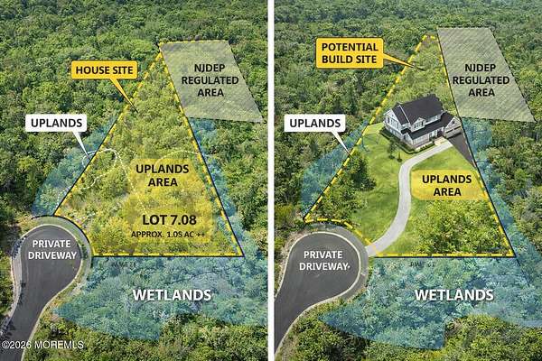 Vacant residential lot located at the end of a cul-de-sac in the Nugentown section of Little Egg Harbor Township. Approximately 1.03 acres per tax records. Zoned residential. Minimum building size per township requirements. Natural gas and electric are located in the street. Well and septic required. Property is being sold strictly AS-IS. Buyer is responsible for all due diligence, inspections, and investigations, including but not limited to zoning, permitted use, setbacks, soil conditions, wetlands, septic feasibility, access, and all municipal, county, state, and NJDEP approvals. Buyer to obtain all required permits and approvals at Buyer's sole cost and expense. Images, aerials, overlays, boundary lines, and any house renderings are for visualization purposes only. They are conceptual in nature, are not engineered, not surveyed, and not approved by the Township of Little Egg Harbor, Ocean County, or the New Jersey Department of Environmental Protection (NJDEP). Property boundaries, wetlands lines, upland areas, access, and potential building locations are approximate and based on publicly available information and/or existing survey documents. No representation is made regarding buildability or permitted improvements. Buyer must independently verify all information and obtain all required approvals prior to construction.