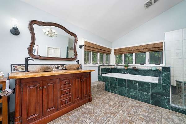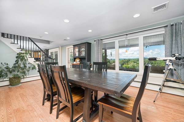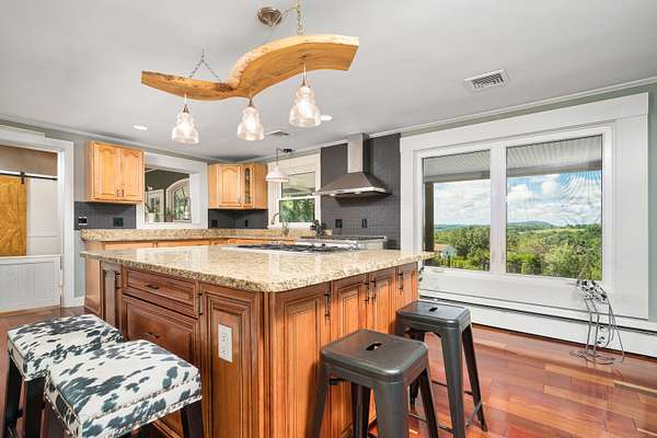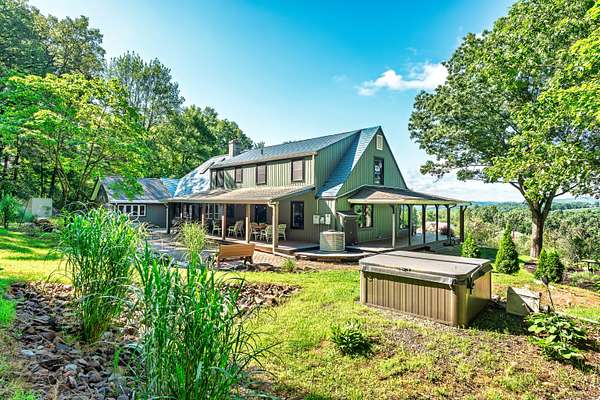Come see what this one-of-a-kind home has to offer! Phenomenal sunsets and views from this 2,836 sq ft Cape with 3 bedrooms, 3 full bathroom, on 5.3 beautiful acres, most of which is fenced! A great property for privacy, animals, and entertaining. The 26'x15' Family Room features soaring cathedral ceilings, maple hardwood floors, 7 skylights and a fireplace with a wood stove insert. The large primary en-suite bedroom boasts bamboo flooring, walk-in closet, large spa-like Master Bath w/2 sinks, jetted tub, walk-in shower, & tiled radiant floor heating., and both the Fam Rm and Primary are heated with a mini splits (Supplemental cooling as well). The 26' x 20' gourmet Kitchen with granite countertops is a chef's dream, featuring a Cafe refrigerator, a new Cafe propane burner stove, and an additional propane cooktop on the large island. The spacious dining room is perfect for hosting large gatherings. Upstairs are 2 oversized bedrooms with a full bath nearby. The paid-off solar panels eliminate electric bills-equating to about an $80,000 mortgage savings. Additional features include central air, first floor laundry room, lifetime metal roof, underground utilities, robotic lawnmower that maintains part of the lawn, over $200K in new mechanicals, windows, siding, and doors, and a three-sided wraparound porch. Enjoy the peaceful sounds of the backyard waterfall and koi pond. Now you can inherit the fruits of their labor.
