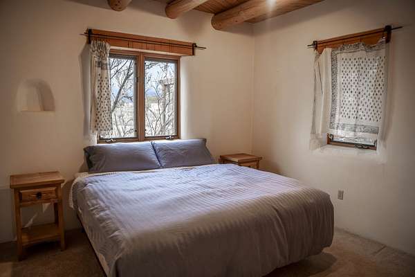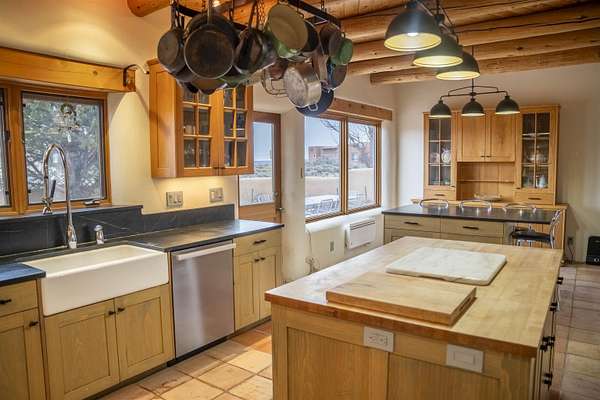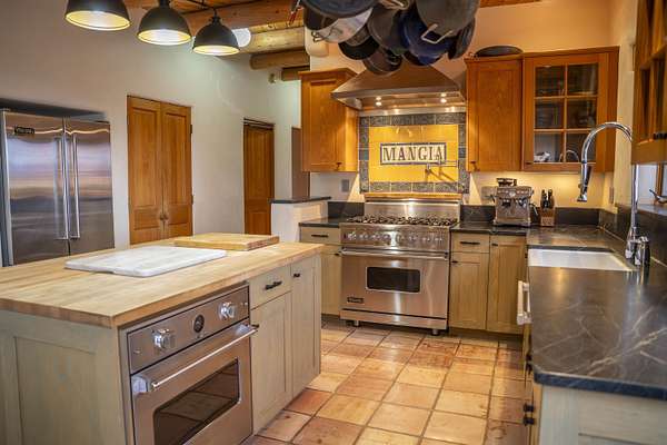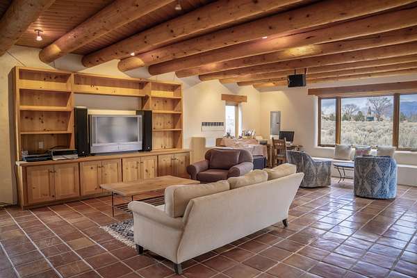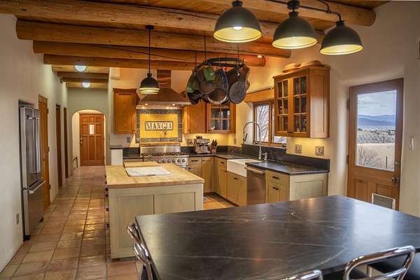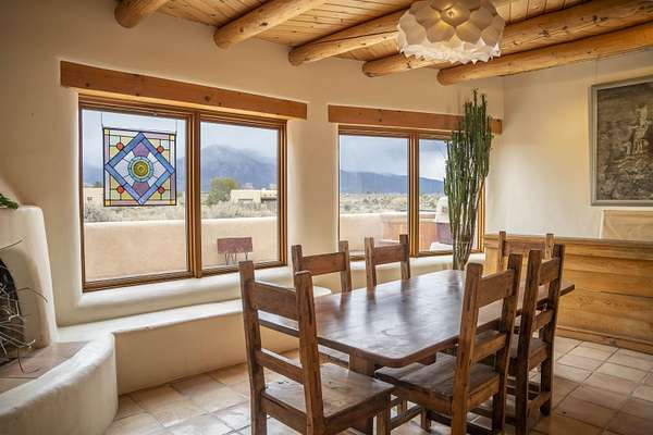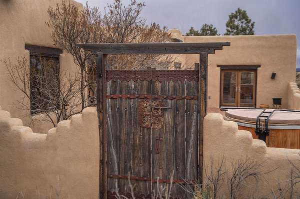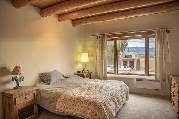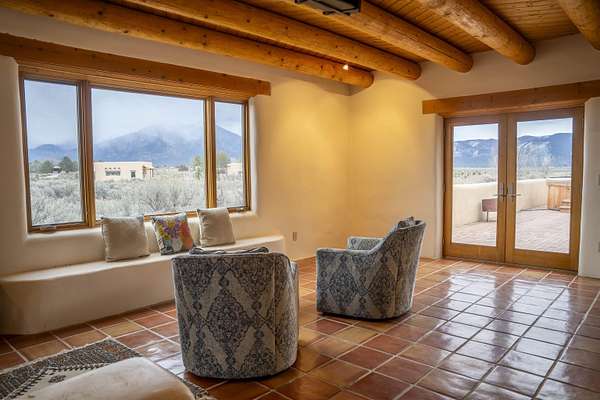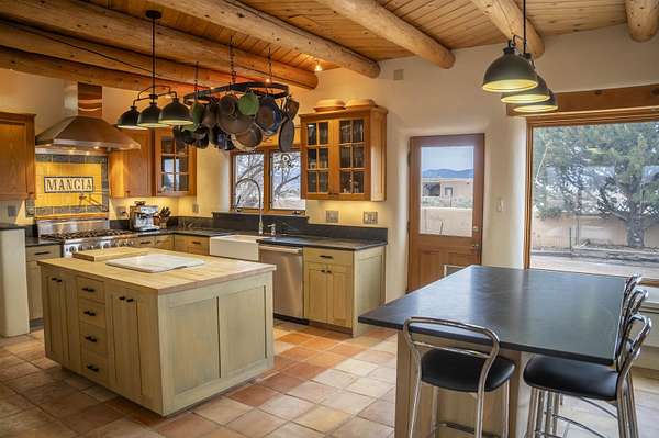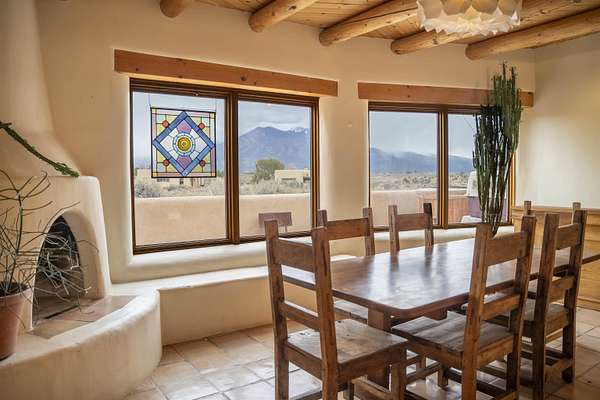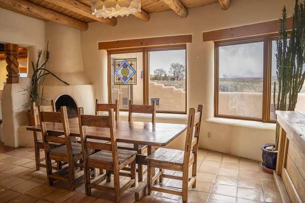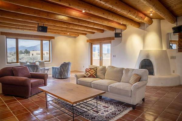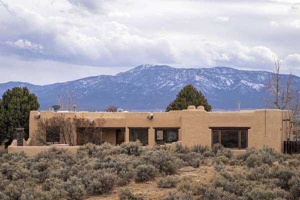 Looking for big views, tranquility and comfort! Well, look no further. Located on a peaceful road off Blueberry Hill, this stunning pueblo-style adobe, built by Godsoe, is a true sanctuary. Listed below appraisal the 2,845 square foot home features three bedrooms, two full baths, and flexible living spaces. Inside, natural light pours through large windows, illuminating rich adobe walls, rustic wood details, and thoughtful solar orientation that enhances year-round comfort. Cozy up by the fireplaces on cool evenings, gather for meals in the charming dining area, or let your culinary creativity shine in the chef's gourmet kitchen with generous counter space, two ovens, pot filler faucet, custom backsplash, Viking appliances and Miele dishwasher. Step outside to a walled courtyard and expansive patios, where you can sip your morning coffee, fire up the outdoor pizza oven for gatherings, or soak in the hot tub and take in the amazing sunsets and night skies. A covered breezeway leads to a spacious 2 car garage, workshop and green house. The 876 square foot workshop/studio is ready to become an artist studio, exercise space, or anything you envision. Eat fresh from your garden, and a greenhouse for year-round growing. Set on 2.16 acres of pristine high desert, it offers plenty of space to roam, relax, and soak in the landscape. Additional perks include natural gas and access to high-speed Wi-Fi. Located between Taos Plaza and Taos Ski Valley, this home offers the best of both worlds-secluded serenity with easy access to world-class skiing, hiking, art, dining, and cultural attractions. Come experience the magic of Taos living!
