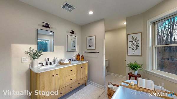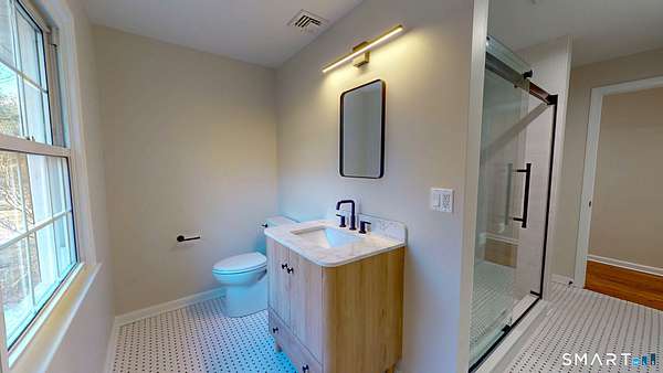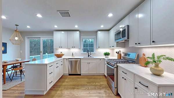 Welcome to this expansive and beautifully updated six-bedroom Colonial, offering three full and two half baths and thoughtfully positioned on a sprawling 2.42-acre lot that provides both privacy and presence. A grand wraparound driveway creates a striking approach to the home, offering ample parking in addition to a two-car attached garage ideal for guests, entertaining, and everyday convenience. Upon entering, you are greeted by a gracious foyer showcasing refinished hardwood flooring that flows seamlessly throughout much of the main level. The foyer opens to an elegant living room, anchored by a classic fireplace that adds warmth and timeless character. The home's open-concept layout is designed to balance refined traditional elements with modern living, creating an inviting atmosphere for both intimate gatherings and large-scale entertaining. The heart of the home is the stunning open-concept kitchen, meticulously designed for both form and function. The kitchen features sleek quartz countertops, stainless steel appliances, updated cabinetry, and new finishes throughout. The spacious eat-in kitchen offers plenty of room for casual dining and flows effortlessly onto a large back deck, where you can enjoy peaceful views overlooking the expansive backyard perfect for outdoor dining, relaxation, or entertaining.