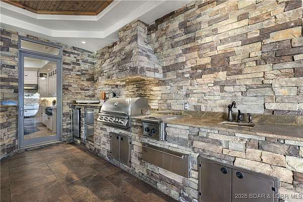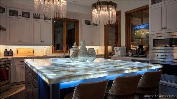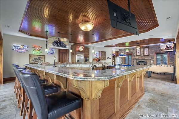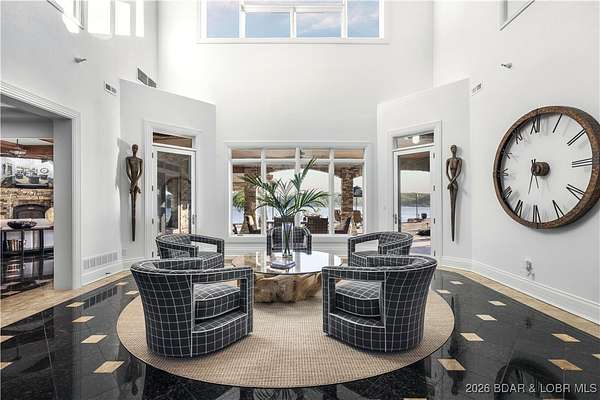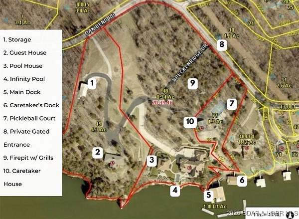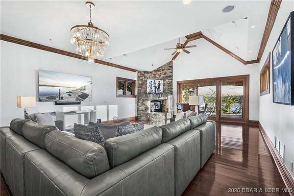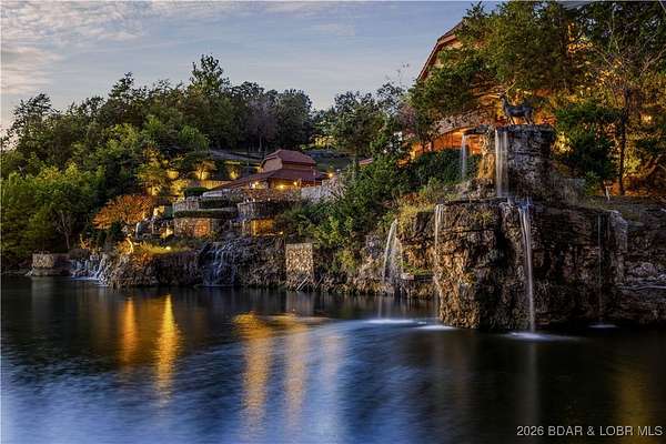 An iconic masterpiece at Lake of the Ozarks, this luxurious estate is a true statement of elegance and craftsmanship. From the exquisite granite tile and rich Brazilian cherry wood floors to the stunning African mahogany doors and crown molding, every detail has been thoughtfully designed. The screened outdoor kitchen provides the perfect setting for entertaining, seamlessly blending indoor and outdoor living. With breathtaking main channel views from the bluff yet an easy walk to the dock. Large wave breaks in place to protect your boats. Infinity pool, leading to a newly built pool house. The pool house includes private guest room, ensuring comfort and privacy. With multiple cascading waterfalls, lush landscaping, and panoramic lake views, this estate is a rare gem. Whether as a private sanctuary or an extraordinary corporate retreat, this property offers an unparalleled lifestyle in one of the lake's most coveted locations. The property features a Care Taker home & and additional Private guest house which have both been completely remodeled in 2024. All three properties are fully furnished by John Elliott Interiors. Located on MM 28. Pickle Ball Court on the property as well.