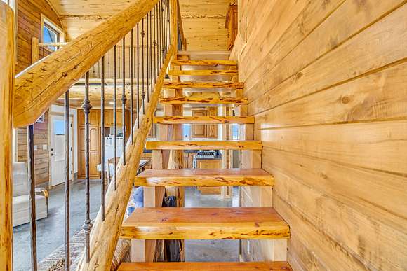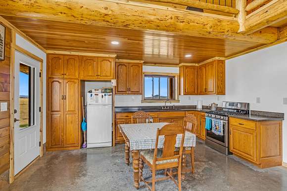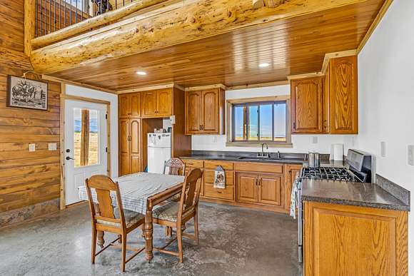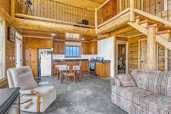 The kitchen is perfect for country life with a gas stove/oven, Meganite countertops, custom Wormy Red Oak cabinetry, blue-stain trim, and Cherry Wood T&G ceilings. The main living area features Aspen walls, log accents, and a Douglas Fir staircase, creating a warm and inviting atmosphere.