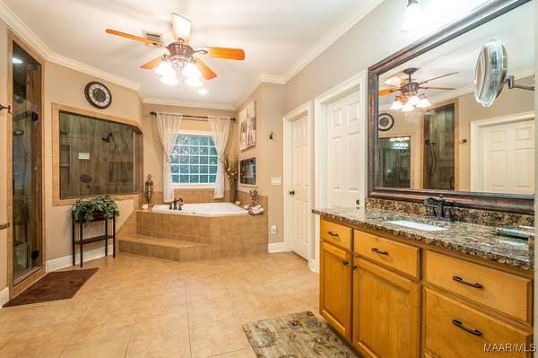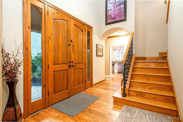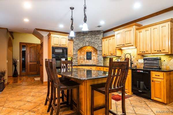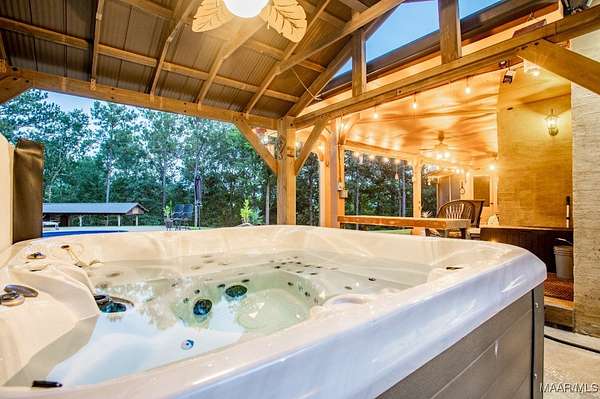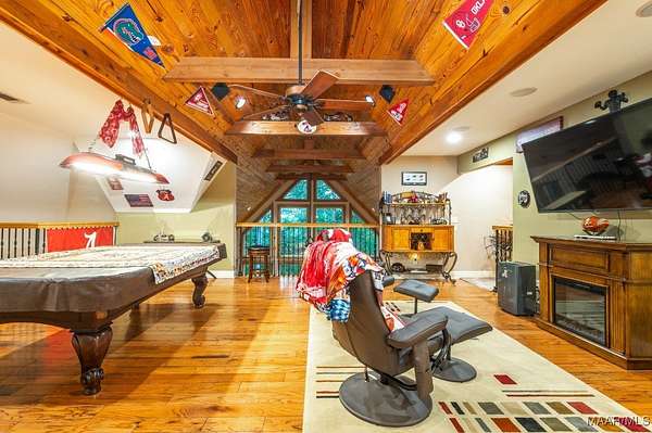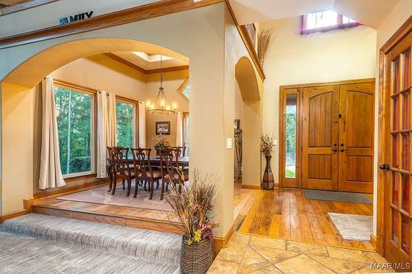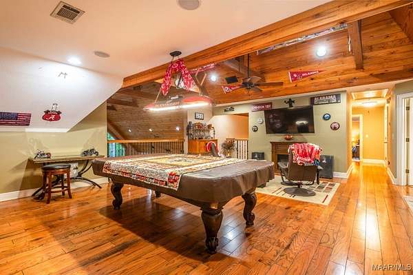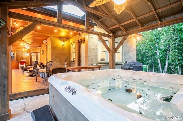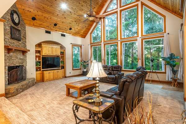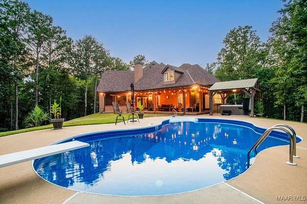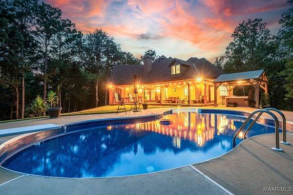 One-of-a-kind estate just minutes from Wetumpka and Montgomery, located on private wooded hilltop with 10.5 acres of breathtaking mountain scenery. A stone and iron security gate welcomes you to a paved, lighted drive leading to this exceptional custom-built home. Stunning great room featuring a floor-to-ceiling stone gas log fireplace, soaring vaulted wood ceilings, and panoramic views. The open-concept kitchen offers a gas cooktop with pot filler, tile and stone accents, built-in oven and microwave, work island, large pantry, custom cabinetry, and granite countertops. The main level includes two bedrooms and 2.5 baths, highlighted by a luxurious primary suite with a private office and spa-like bath featuring an oversized frameless glass shower with four showerheads, jetted soaking tub, electric fireplace, and two expansive walk-in closets. Upstairs, enjoy a spacious recreation room with wet bar, granite countertops, mini fridge, pool table area, and open lounge space overlooking the great room. Two additional bedrooms are located upstairs, including an oversized guest suite. Outdoor living is equally impressive with a large open covered porch, enclosed screened porch, patios, swimming pool, gazebo with hot tub & fire pits. The property also features a three-car garage with storage, plus a separate garage/workshop, large walk up floored attic space above garage and private porch area with fence surround off garage. Recent seller updates include: New Hardie board exterior siding, Architectural roof (2024), Pool liner (Spring 2025), Porcelain tile on exterior porch, Gazebo with hot tub, Whole-house backup generator, Two fire pits, Trails throughout the property, Septic pumped (December 2025), and Termite bond with Zap. This extraordinary property offers unmatched privacy, luxury, and views that must be experienced to be fully appreciated.