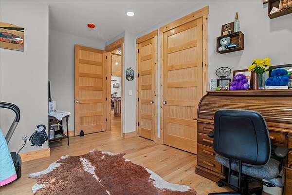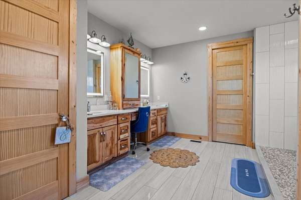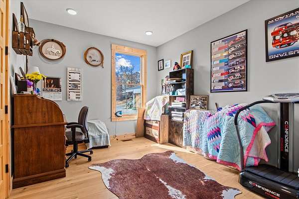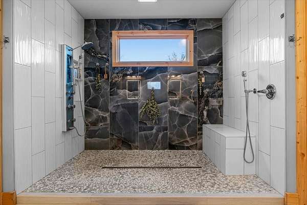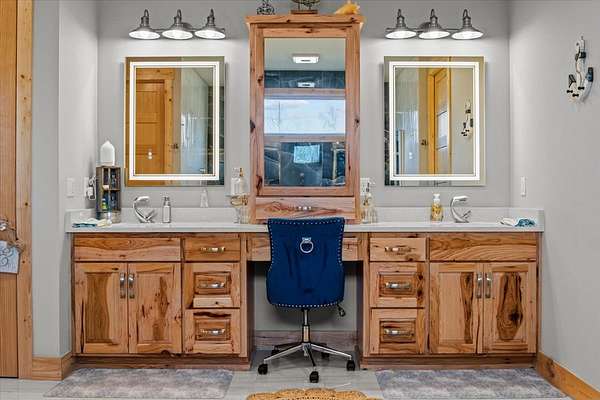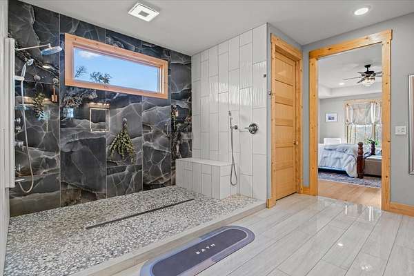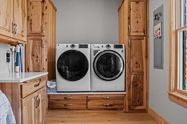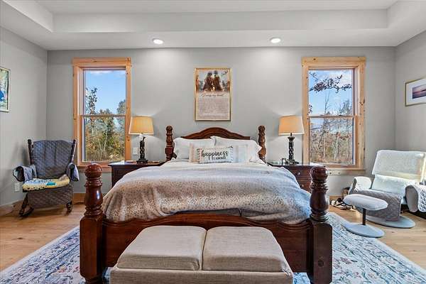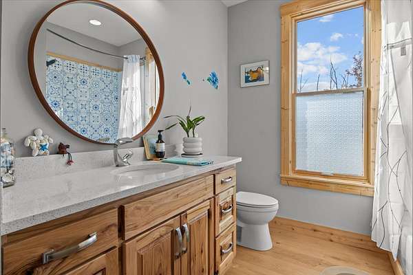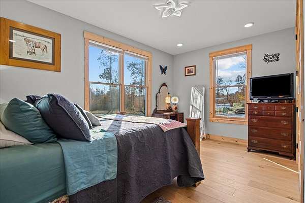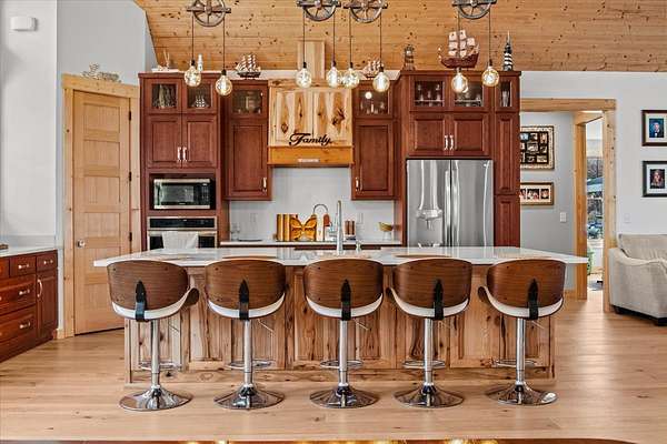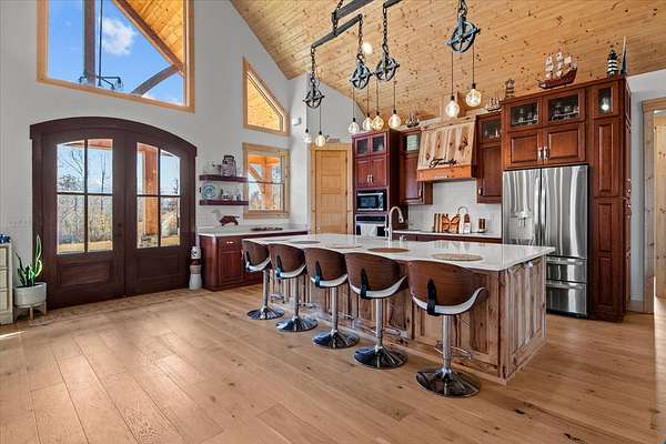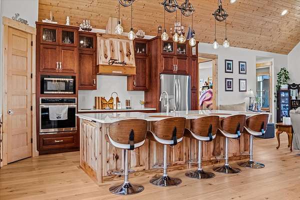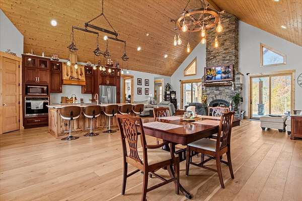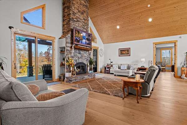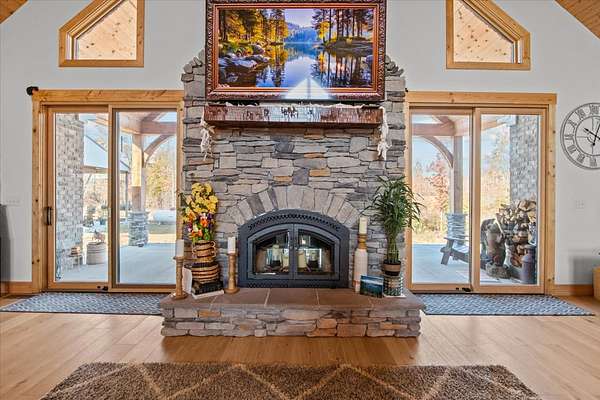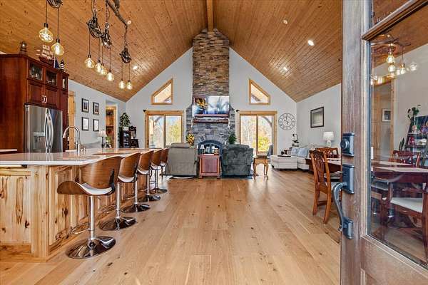 Inside, the home showcases oak hardwood flooring, a lovely bamboo kitchen sink, and a spacious quartz island accented by uniquely and beautifully designed lighting above. A gorgeous stone, wood-burning fireplace serves as the heart of the home, creating a warm and inviting gathering space. Large windows fill the interior with natural light and offer serene views of the surrounding land.