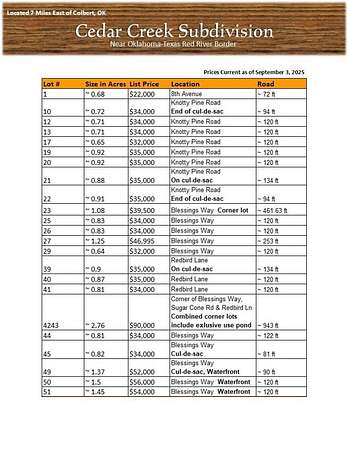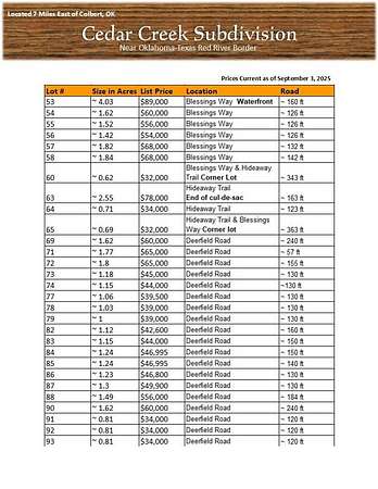 "Hideaway Corner," a charming homesite ready for a custom home on a smaller corner lot. Country feel in a neighborhood setting! Discover privacy, beauty, and endless possibilities with this 0.62 of an acre homesite ready for your vision of country life. WHY THIS PROPERTY STANDS OUT - Prime location: Only 16 miles from Denison, TX and 12 miles from Durant, OK. Enjoy the perfect balance of quiet country living close to city conveniences. RECREATION AT YOUR DOORSTEP - Only minutes from Lake Texoma, Burns Flat boat ramp, Choctaw Casino, golfing, shopping, dining, movies, bowling, arcade and so much more! BUILD THE LIFE YOU'VE IMAGINED - Picture mornings with coffee watching the sunrise paint the sky with amazing color, walking in the neighborhood and cozy winters gazing at the country setting from expansive windows. Design your custom home, one or two stories and take advantage of panoramic views, balconies, and even an outdoor living space with a kitchen, fireplace and TV. READY FOR YOUR VISION - 1. Utilities buried along the roads throughout subdivision. OG&E electric, Achille municipal water and Cherokee Communications high-speed internet. 2. Buyer installs septic and connects utilities from the road. 3. Subdivision roads maintained by Bryan County Commissioners. COMMUNITY HIGHLIGHTS - Country living in a neighborhood setting. Located outside city limits. No HOA fees. 1,200 sq ft minimum living space, log, stone, brick, siding, and even barndominiums welcome! No manufactured homes. ENDLESS LIFESTYLE POSSIBILITIES - With lot corners clearly marked and trails cut throughout subdivision, it is easy to walk the land and start envisioning your future. THIS IS RAW LAND WITH UNLIMITED POTENTIAL - a canvas for your dream country lifestyle. Call today for details and to explore the remaining building sites in the Cedar Creek Subdivision, just 7 miles east of Colbert, Oklahoma. Your new life is only one phone call away... take the first step today!