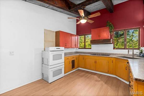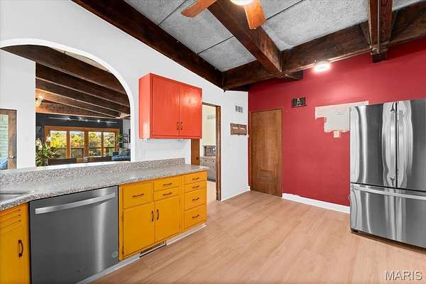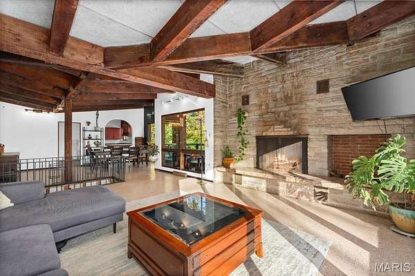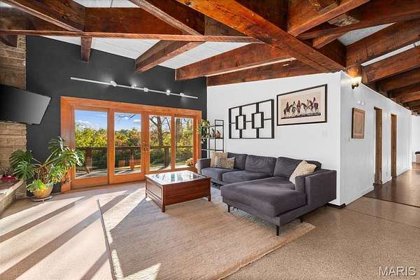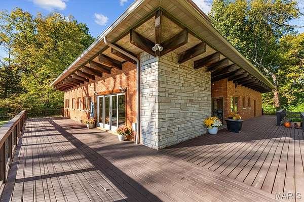 Welcome to your own slice of Mid-Century Modern paradise! This charming ranch-style home, built in 1961, offers you a wonderful opportunity to dive into a truly unique living experience. As you approach, the stunning brick facade and impressive solid wooden beams that crown the roofline will instantly catch your eye. The beautifully landscaped flower court at the entrance creates a captivating first impression, inviting you to step inside and discover the beauty that awaits. Once you enter, you'll be enveloped by natural light streaming through a spectacular wall of windows. This hallmark of Mid-Century Modern design promotes a seamless blend between indoor and outdoor living. Picture yourself sipping your morning coffee or unwinding after a long day on the expansive wraparound deck, which is easily accessible from various living areas. It's the perfect spot to embrace the beauty of nature! As you stroll across the gleaming terrazzo floors, you'll appreciate the craftsmanship that showcases the retro elegance of this home. The magnificent stone fireplace, a cozy centerpiece for gatherings, invites warmth and comfort. The sleek wooden beams throughout add a touch of character while resonating with a love for natural materials. Plus, the Tectum panels enhance the acoustic quality of the living areas, creating an inviting and serene atmosphere, ideal for lively gatherings or quiet moments of reflection. The open-concept layout flows seamlessly, encouraging meaningful conversations as your dining room transitions effortlessly into a spacious living room. The charming arched window connecting the dining area to the kitchen not only enhances the open feel but also adds an elegant touch, setting the stage for unforgettable dinner parties or cozy family nights. Imagine the laughter, love, and enticing aromas filling your home, creating an intimate, joyful environment. Each of the three generously sized bedrooms serves as a peaceful retreat. With elegant vertical windows high on the walls, they let in plenty of sunlight while ensuring your privacy. Thoughtful built-in closets keep everything organized and tidy. Plus, pocket doors stylishly partition the spaces. Picture waking up refreshed in your tranquil sanctuary, ready to tackle the day. There's even the opportunity to customize one of the bedrooms into a serene home office or a dreamy creative studio; this space is your canvas to express yourself! And let's not forget about the basement, a true gem with gorgeous floating stairs that lead you down with flair. This inviting area features walk-out access that connects you to your outdoor oasis, making it perfect for entertaining. The second fireplace casts a cozy glow, creating an ideal backdrop for heartwarming moments. With a built-in masonry oven, you'll unleash your culinary creativity, whether you're baking fresh bread or roasting your favorite dishes, the possibilities are endless in this versatile haven. Set on a breathtaking 5-acre retreat, this home envelops you in tranquil natural beauty. Spend lazy summer days lounging in your expansive yard, where you can create a vibrant garden, set up a serene reading nook, or design the perfect outdoor entertainment area. This Mid-Century Modern masterpiece isn't just a house; it's an invitation to a lifestyle that cherishes design, comfort, and connection. Experience the magic of living in a space where cherished memories are just waiting to be made and where your vision can truly flourish. This gem is ready for you--schedule a viewing today and step into a world of elegance and serenity!