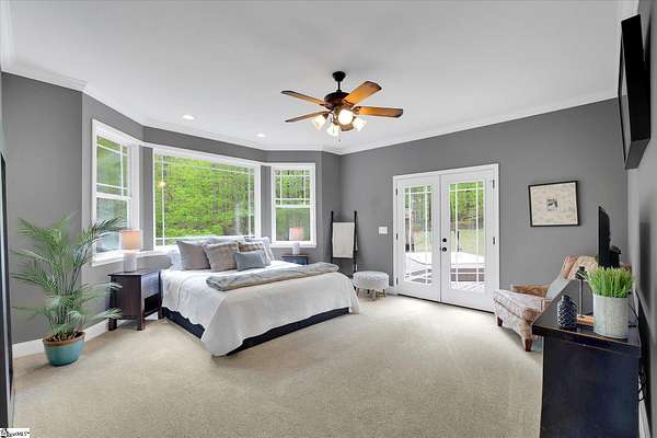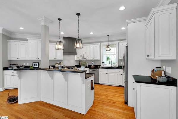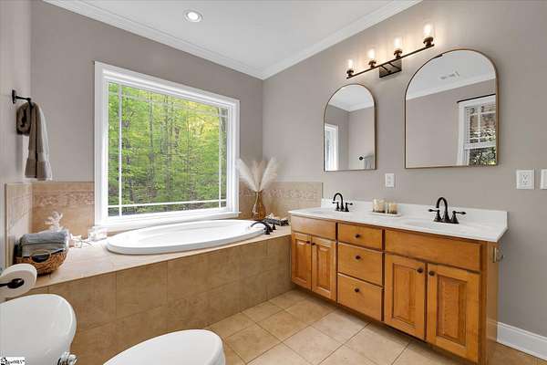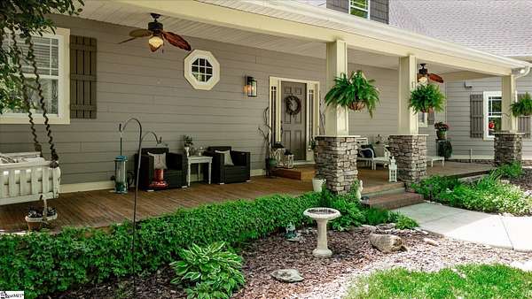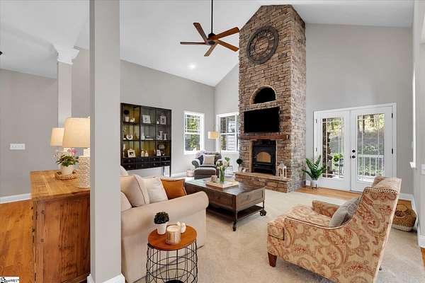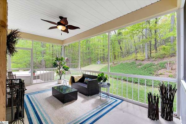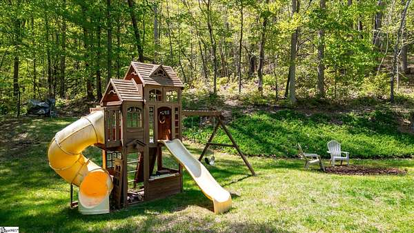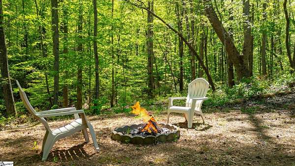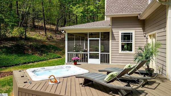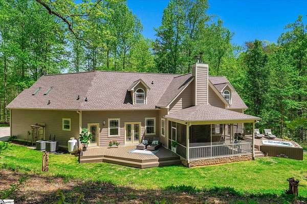 This home is a rare treasure. Such a private sanctuary in the woods, but convenient to the charming downtown of Travelers Rest or downtown Greenville. In addition you can get to Hendersonville and Asheville NC with just a short drive. This 3 bedroom 2.5 bath home has a beautiful and bright open floor plan perfect for entertaining family and friends. Walk in and you are greeted with a warm and cozy rock wood burning fireplace , soaring ceilings, and windows that bring the outdoors in. Relax on your large screened in porch, or unwind after a long day in the hot tub deck that is located off the main floor primary suite. This large bedroom has a full bath with a tile shower and a large garden tub. Make meals in your bright and beautiful kitchen with gas stove, custom vent hood, stainless steel appliances, and granite countertops. The kitchen is open to the living and dining room which makes entertaining so easy!. Sit on your large front porch and relax in the swing while listening to the birds sing all around you. Upstairs there is a large bedroom with a sitting area and 2 large closets, and another HUGE bedroom and a large bath. Also a large storage room that was once used as a dark room that could have a myriad of uses. Outside there is a fire pit, playground and over 5 acres for you to roam and enjoy. The home also has a new roof with a 50 year transferrable warranty.The neighborhood is like a state park with a neighborhood lake and trails throughout. Also close to several orchards and wineries. Don't miss this one! Come see it today!