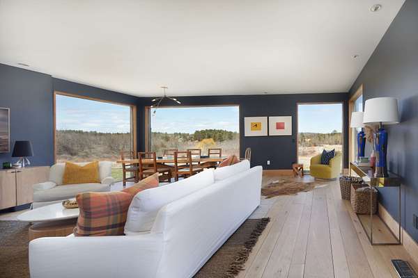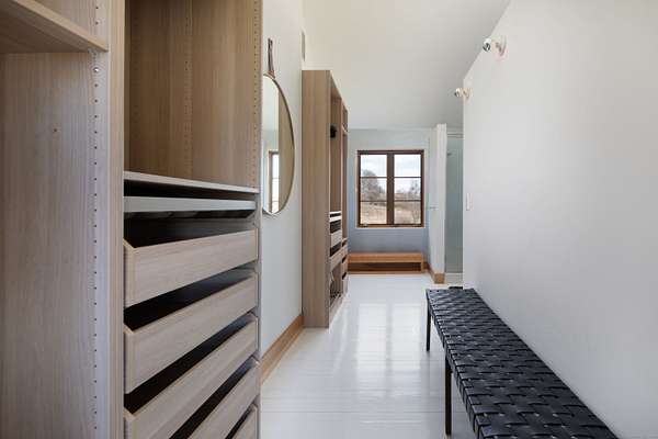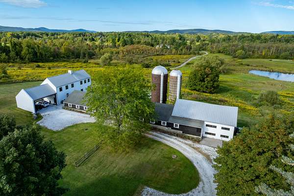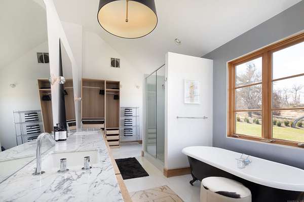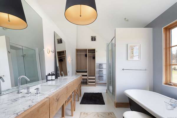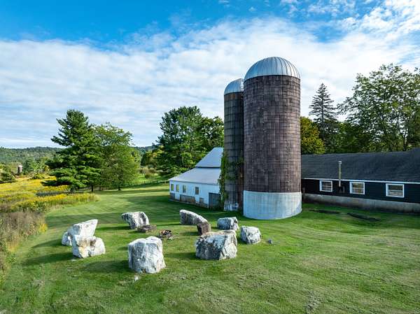 Meticulously designed modern farmhouse set on 10.70 acres along one of Litchfield County's picaresque roads, featuring stunning views over protected land. This 2,880 sq ft light-filled home showcases natural materials and timeless architecture with an open floor plan organized around a commanding two-sided granite curbstone fireplace that unites the living room and chef's kitchen. The residence features white oak wide-board floors throughout, custom cabinetry, butcher block and honed Carrera marble countertops, five-burner cooktop, and large sheets of glass that eliminate barriers between indoors and out. The thoughtful layout includes an office/bedroom and half bath on the main level, with additional bedrooms including a primary suite with clawfoot tub upstairs - all finished with enameled wood floors and quality finishes.The property's historic character is enhanced by an 1880's three-bedroom, two-bath homestead with an artist studio, complemented by two long barns and a pair of distinctive silos. The impressive main 160'x40' barn has been transformed into an entertainment space with exposed trusses, polished concrete floors, private office area, and open workspace - all fully heated and cooled for year-round enjoyment. Conveniently located near Lakeville, Salisbury, Hotchkiss, Indian Mountain School, and Millerton with easy access to Metro-North trains. Conservation easement with Salisbury Land Trust ensures the preservation of this exceptional property's natural beauty.