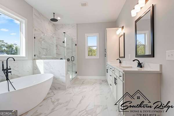 Double Vanity, Master On Main Level, Separate Shower, Soaking Tub, Split Bedroom Plan, Walk-In Closet(s)