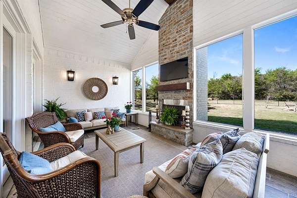 - Covered Patio/Porch, Fence, Lighting, Outdoor Living Center, Rain Gutters