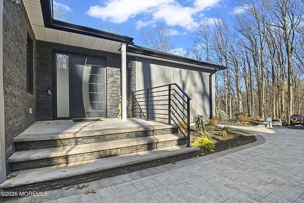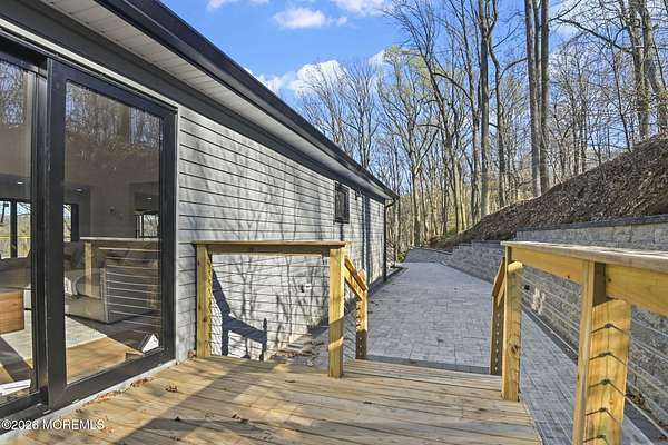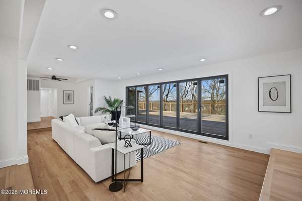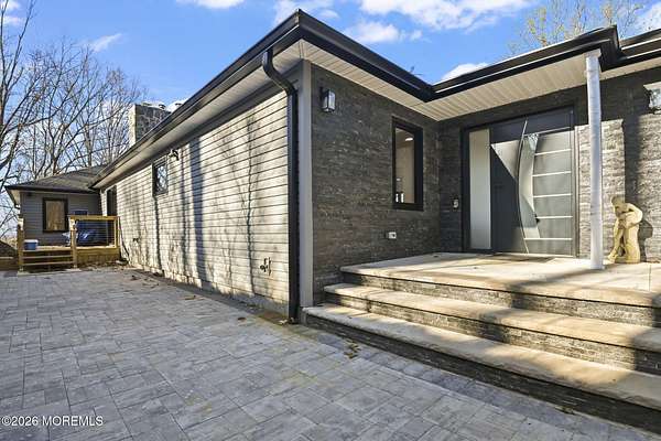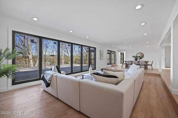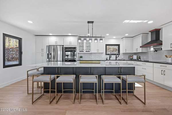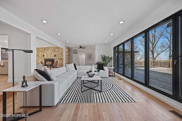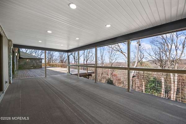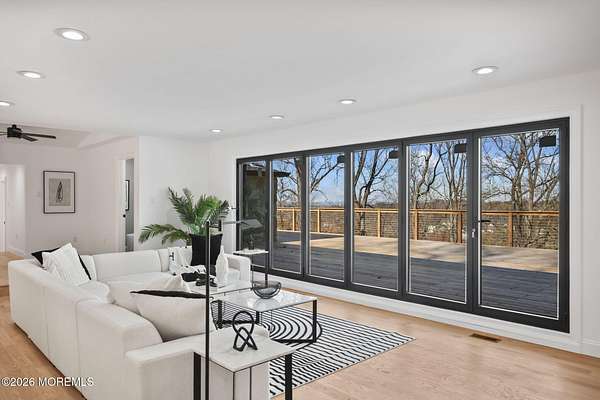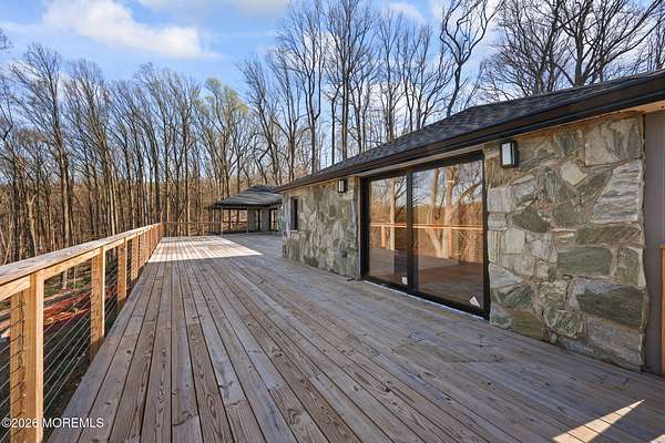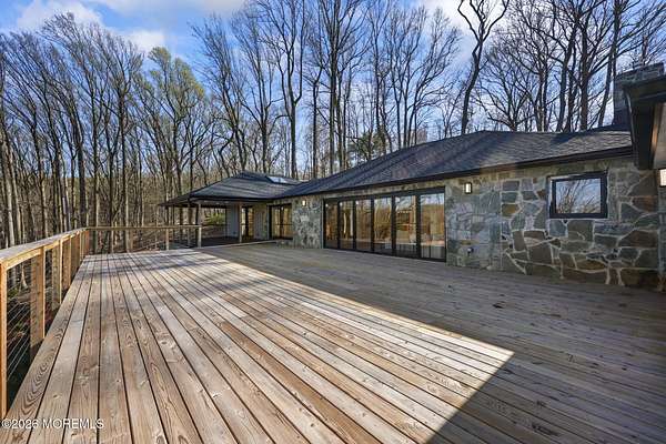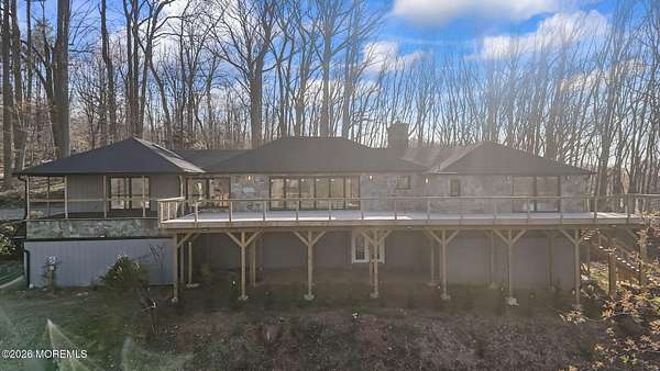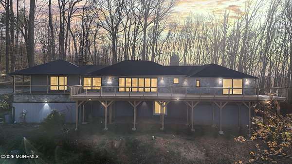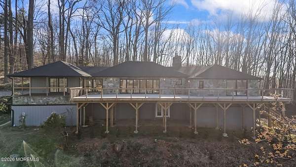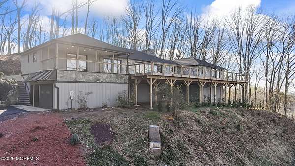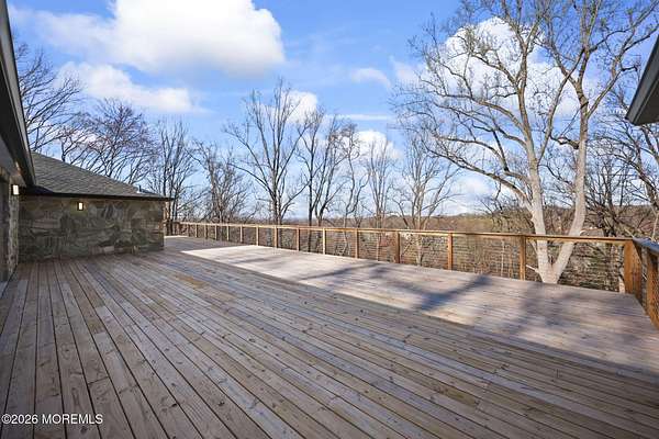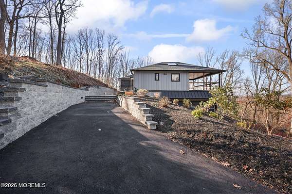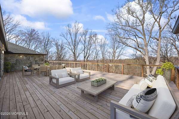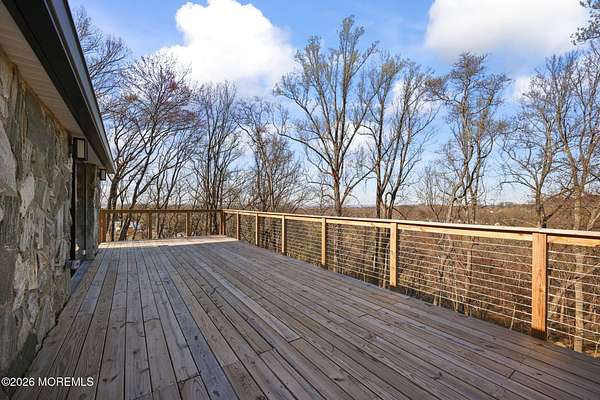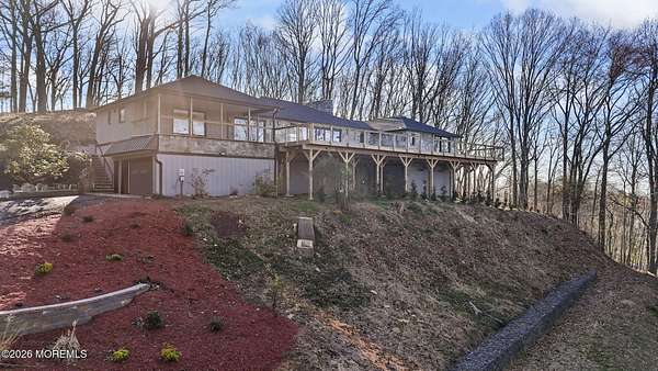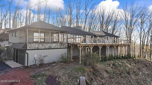 Perched atop a private hilltop, this extraordinary residence showcases sweeping, unobstructed views of the Raritan Bay and iconic NYC skyline--offering a truly elevated lifestyle. This fully reimagined raised ranch features ~3,000 SF on the main level plus an additional 1,500 SF lower level with soaring ceilings and walk-out access to the patio and garage. The designer kitchen is a showpiece with quartz island, custom cabinetry, gold hardware, farmhouse sink, pot filler, herringbone backsplash, and top-tier appliances. Open-concept living boasts rich wood floors, recessed lighting, a stone-front wood-burning stove, and a sunken living room with a dramatic accordion glass wall opening to a 1,500 SF wraparound deck for seamless indoor-outdoor living. The luxurious primary suite offers deck access and a spa-like bath. A stunning guest suite and spacious bedrooms complete the home. All just minutes to transit, shopping, and dining--this is a rare blend of luxury, design, and breathtaking views.