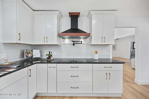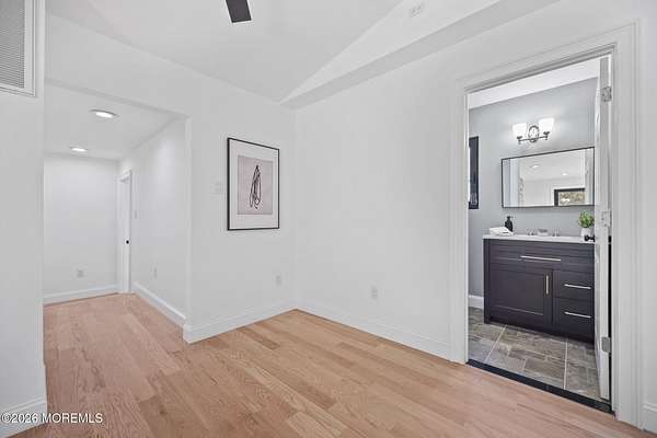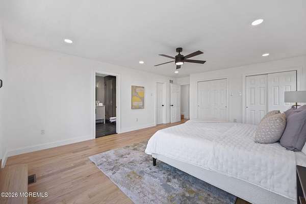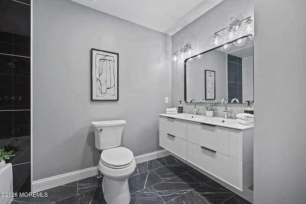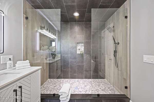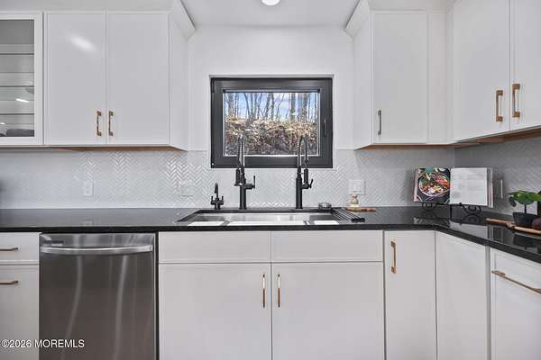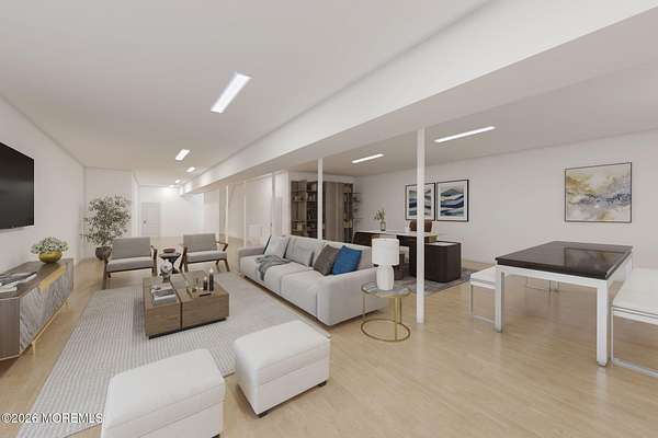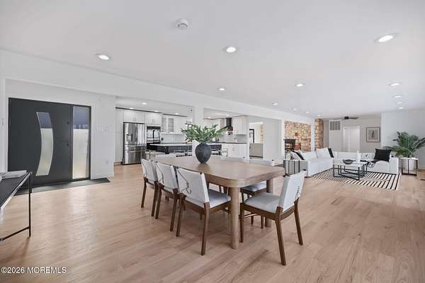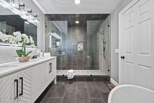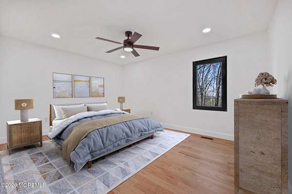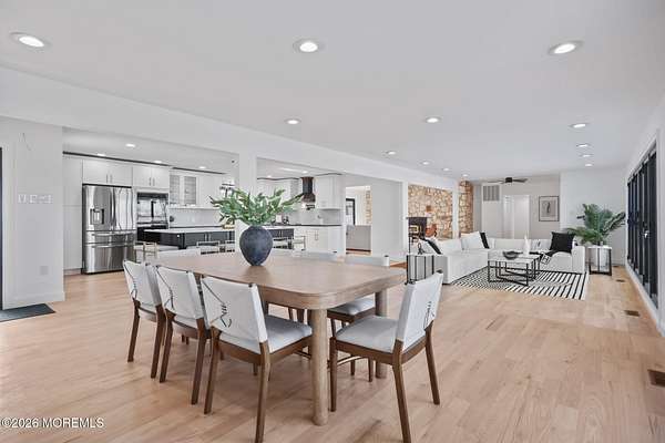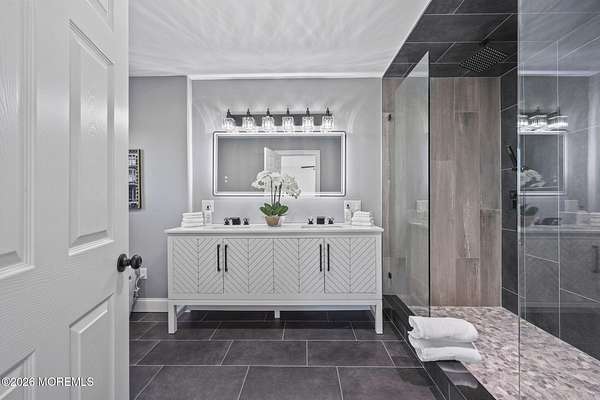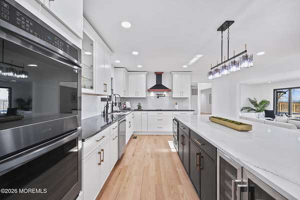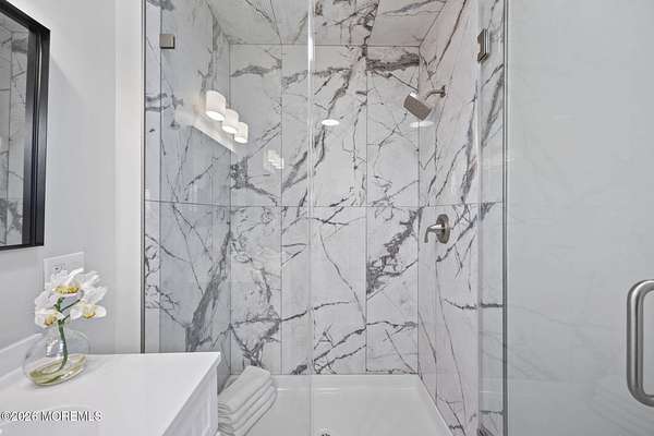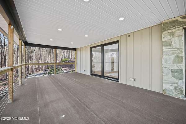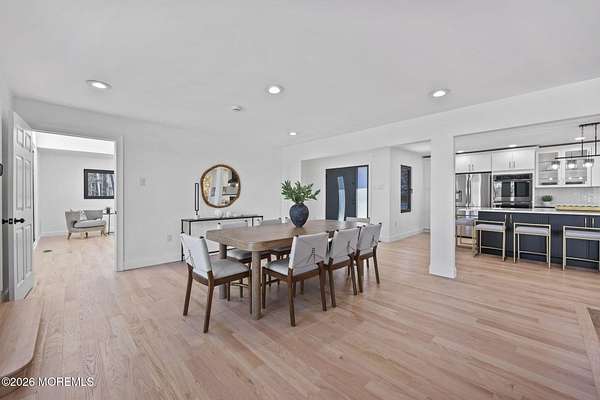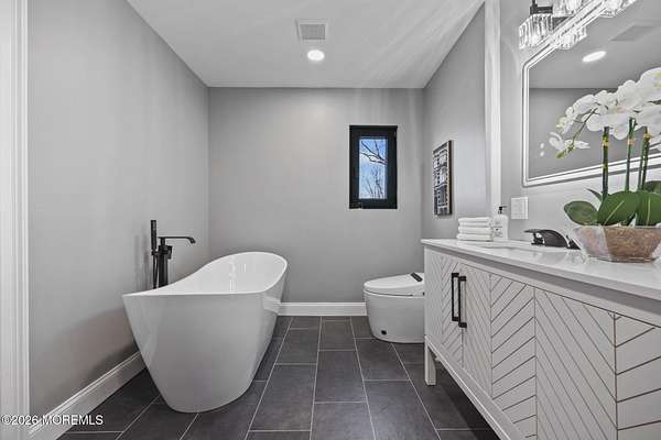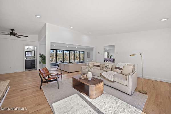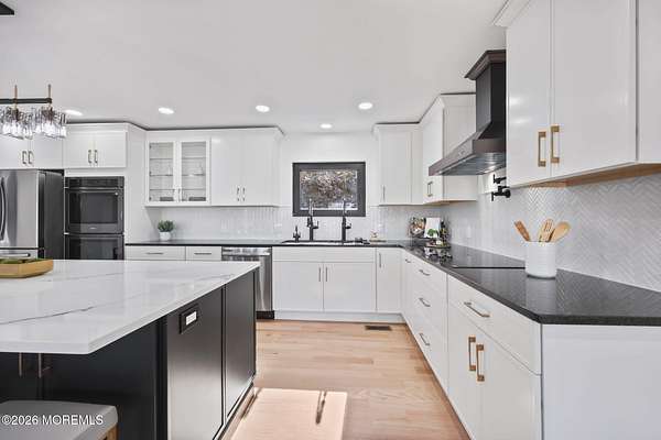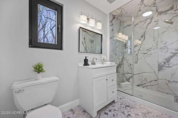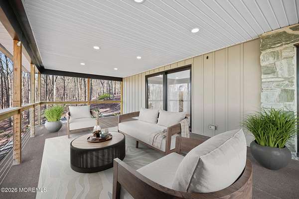 Perched atop a private hilltop, this extraordinary residence showcases sweeping, unobstructed views of the Raritan Bay and iconic NYC skyline--offering a truly elevated lifestyle. This fully reimagined raised ranch features ~3,000 SF on the main level plus an additional 1,500 SF lower level with soaring ceilings and walk-out access to the patio and garage. The designer kitchen is a showpiece with quartz island, custom cabinetry, gold hardware, farmhouse sink, pot filler, herringbone backsplash, and top-tier appliances. Open-concept living boasts rich wood floors, recessed lighting, a stone-front wood-burning stove, and a sunken living room with a dramatic accordion glass wall opening to a 1,500 SF wraparound deck for seamless indoor-outdoor living. The luxurious primary suite offers deck access and a spa-like bath. A stunning guest suite and spacious bedrooms complete the home. All just minutes to transit, shopping, and dining--this is a rare blend of luxury, design, and breathtaking views.