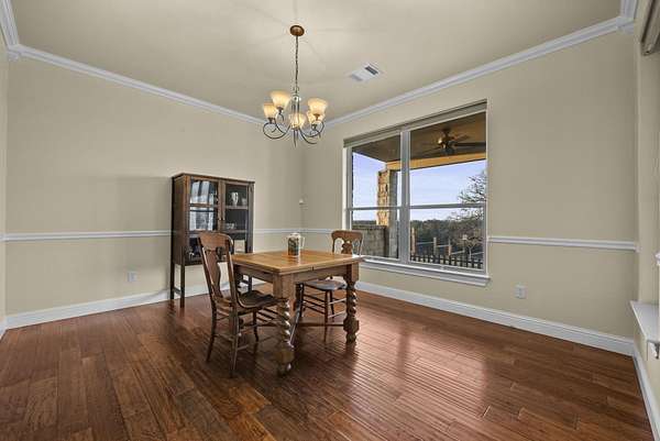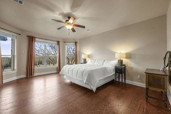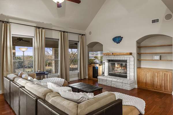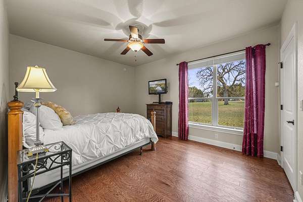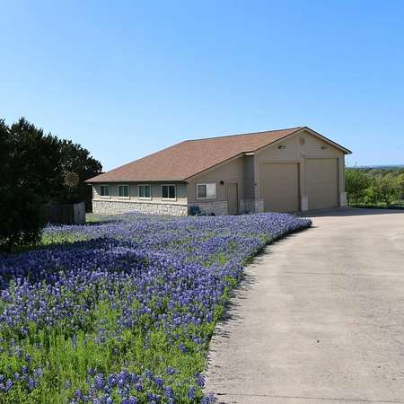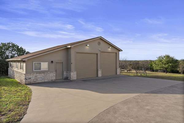 Live at the top and have the views and all the lifestyle options. Priced well below Burnet CAD taxable value. This end of the road, cul-de-sac 3.44 acre lot is choice. Enjoy floorplan flexibility and lots of opportunity for hobbies. Home features one story living with large primary suite and secondary bedroom suite downstairs. Additional bedrooms/office/game room/media room space upstairs. Huge conditioned, easily accessible storage space or future living space expansion upstairs. No carpet, with wood and tile floors throughout. Large covered back porch and upstairs porch to take in ALL the views. Oversized attached, two car garage PLUS huge detached garage for RV, boat, ATV, equipment, toys or all of those. Includes attached workshop for workout area, studio, or whatever you need it to be. Fruit trees, garden areas already in place. Rainwater catchment off of home and detached garage. High speed internet allows for working from home, and running today's technology and devices. Double Horn is a gated subdivision, with a hill country feel, without being too far from conveniences. Double Horn features a community amenity center with pool, pavilion, restrooms, playground, sport courts and pond. 25 to 30 minutes into Bee Cave and Lakeway. 15 to 20 into Marble Falls.
