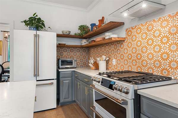 - Dishwasher, Disposal, Exhaust Fan, Free-Standing Range, Microwave, Stainless Steel Appliance(s), Water Heater