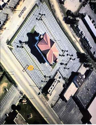 Going East on Bluff Road towards Will B, STADIUM PLACE is on the left between Bojangles and Waffle House. Parking space 14 is in the middle of front row along Bluff Road.