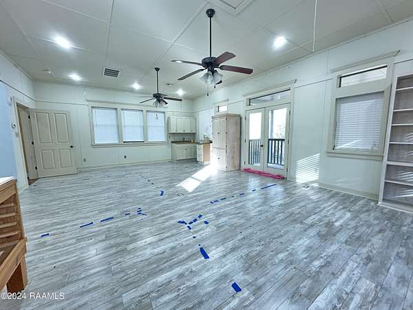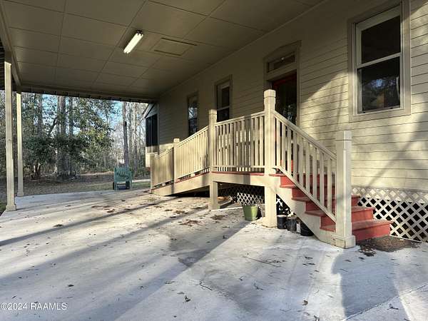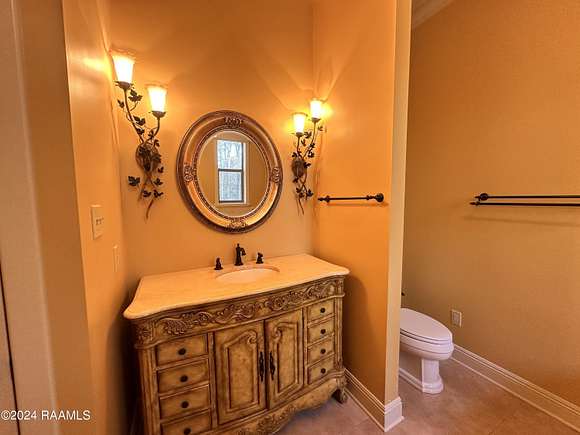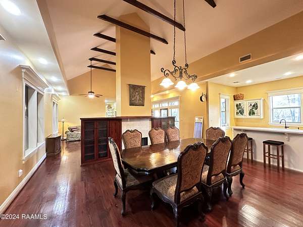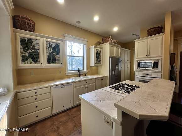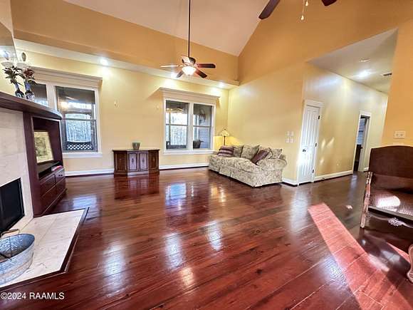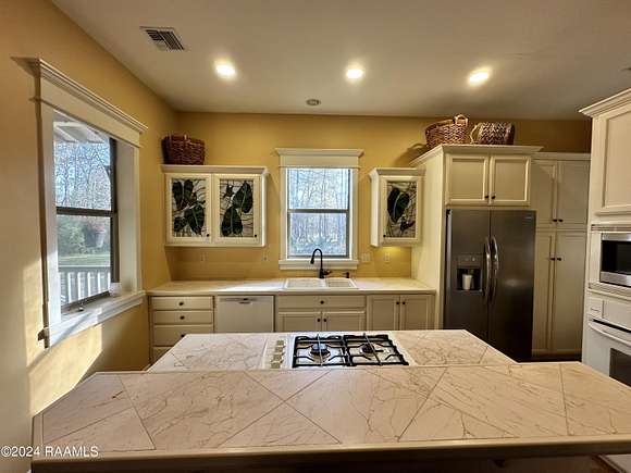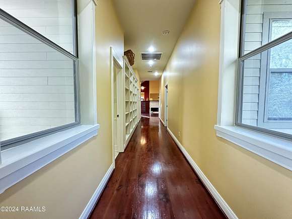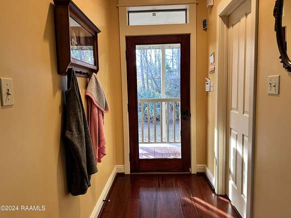 Welcome to this charming Acadian Style cottage nestled on secluded acreage at 1200 North Wilderness Trail with Bayou frontage. As you drive up the driveway, you will instantly feel peace and serenity. This delightful 3-bedroom, 2-bathroom house offers a peaceful retreat surrounded by nature's beauty. As you step inside, you will be greeted by the warm ambiance of wood floors and the inviting atmosphere created by vaulted ceilings. Natural light floods the living spaces through windows, creating a bright and airy feel throughout the home. The kitchen features an island with a gas cooktop, storage and place for seating, great for visiting with guests while preparing and cooking meals. You can not miss the 3 gorgeous stained glass cabinet doors, adding an extra flair to the space. The large open dining room is just off of the kitchen. The gorgeous credenza separates the dining and living space without dividing it, keeping that bright and airy feel! The double fireplace sits inside the credenza creating an ambiance for both the dining and living rooms. You will also find a wine fridge and lots of storage in this credenza. The flip side of the credenza is the living space with more storage in the credenza, a place for a TV and fireplace. The thoughtfully designed layout includes built-ins and an office nook, providing functional spaces for work or study. Home is handicap accessible including a ramp and an extra wide hallway with large bedrooms. Your guests will feel right at home with a nice-sized guest bedroom and bath with a cast iron clawfoot tub. Enjoy the oversized primary bedroom and relax in your jetted tub. Also includes a separate shower, vanity and storage. The large bonus room offers endless possibilities, whether you envision it as a media room, extra bedroom, craft room or additional living area. Escape to the serenity of the outdoors on the screened-in back porch to enjoy your morning coffee or hosting gatherings.