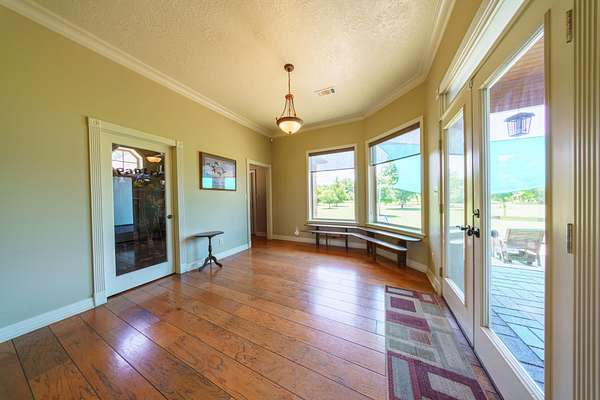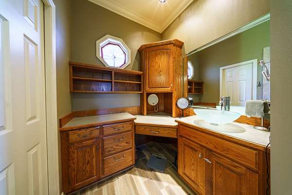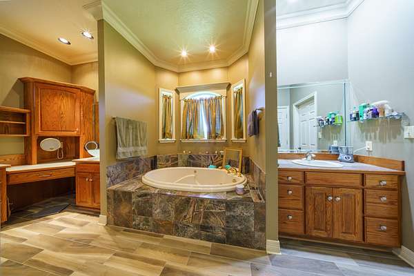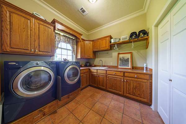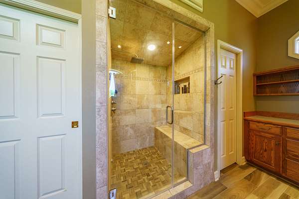 The laundry room has ample cabinetry and a wash sink, just off the half bath and 3-car garage. A covered back patioinvites you to relax and enjoy the views--frequented by deer and turkey. Off the living room is a guest bedroom with direct access to a full bath. The primary suite includes patio access, a Mr Steam Shower, jetted soaking tub, his and hers vanity and a nice walk-in closet.